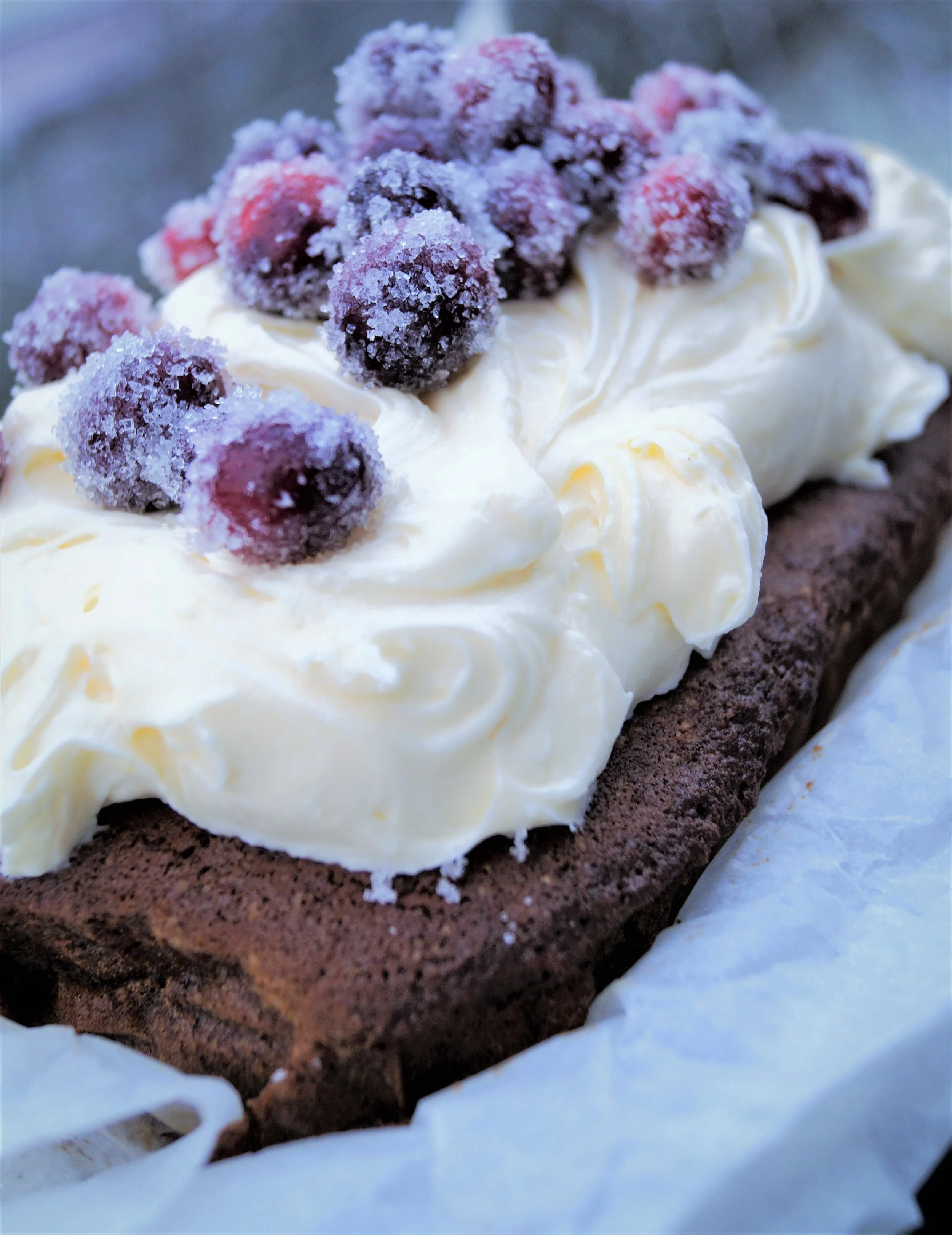 Myk pepperkake med creamcheese frosting og sukrede tranebær