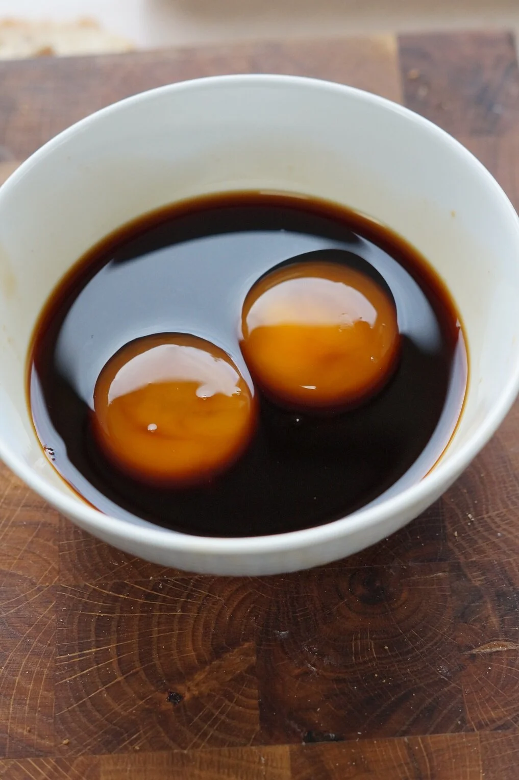 1. Start med å legge 2 eggeplommer i en bolle og hell på soyasaus. Sett kjølig, gjerne over natten. De trenger ikke dekkes helt av soya. jeg snudde mine etter halvparten av tiden, slik at begge sidene blir marinert.
