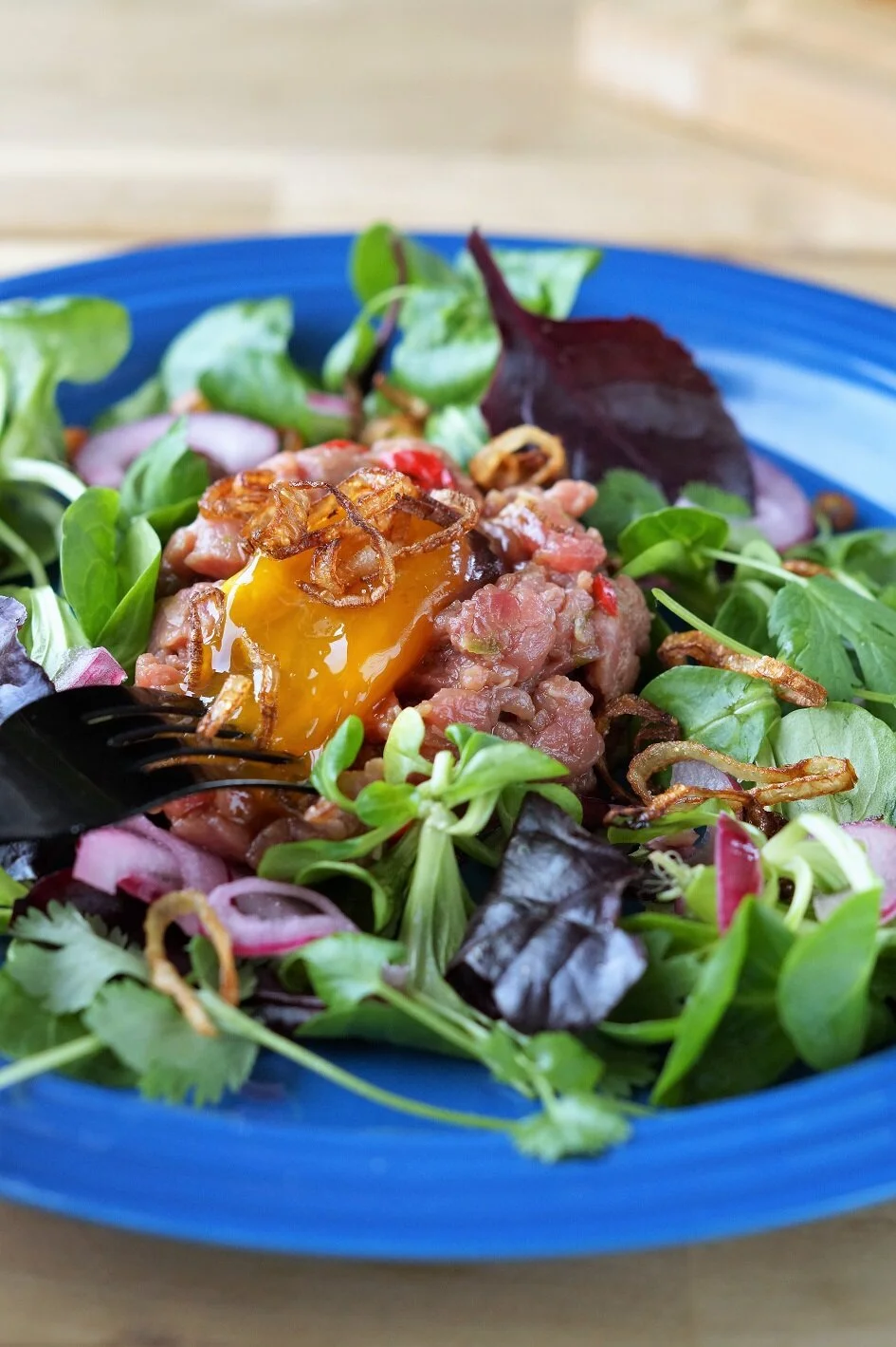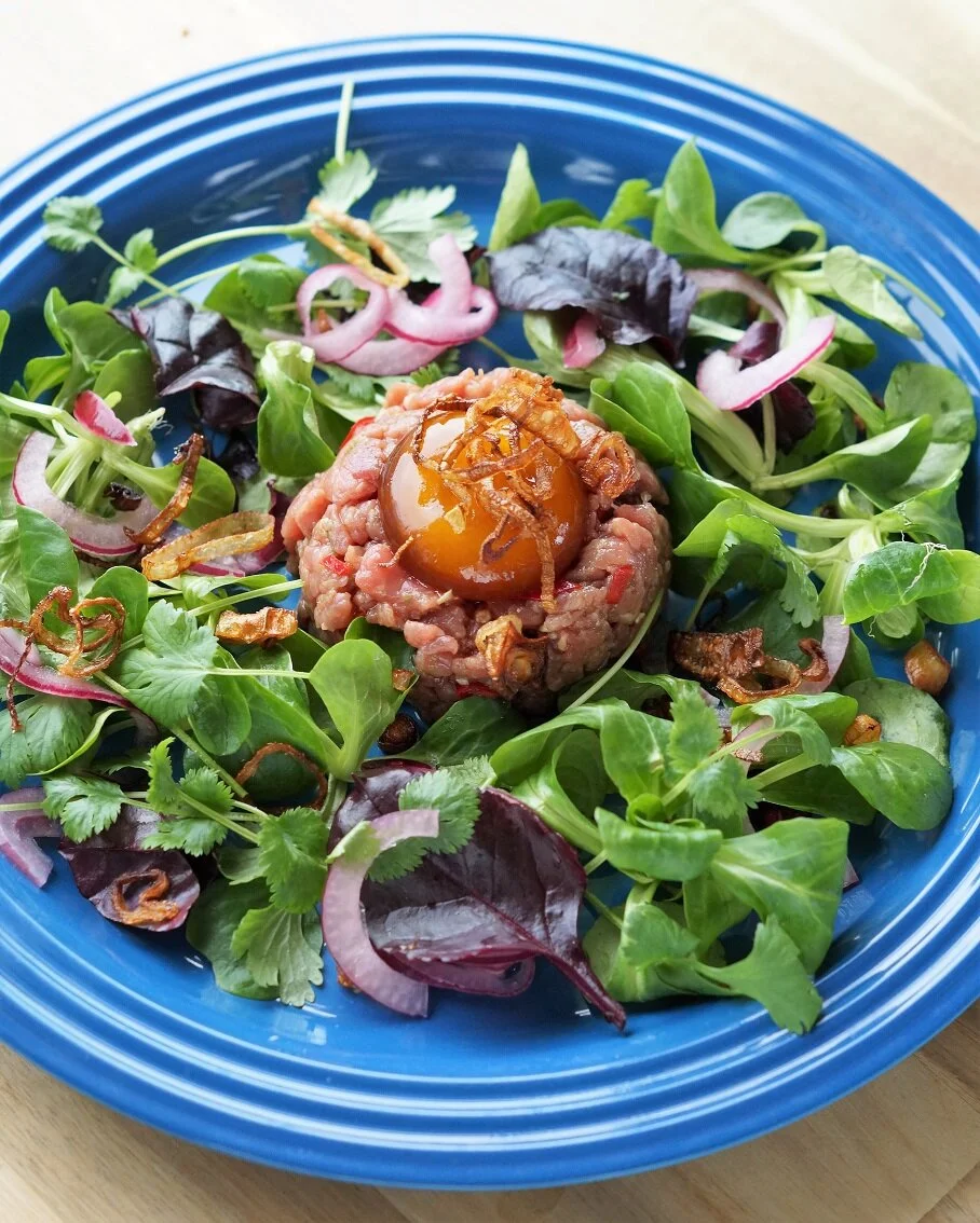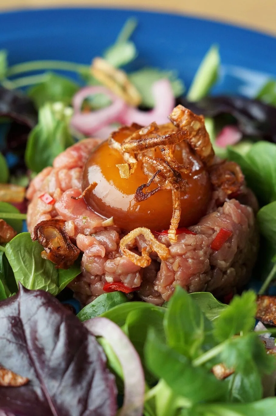 Dette er en asiatisk variant av klassikeren råbiff. Utgangspunktet er det samme: kjøtt av god kvalitet - finskåret eller malt, som serveres med rå eggeplomme. Jeg marinerte min eggeplomme i soya over natten. Soyaen trekker inn i eggeplommen, og gjør den fastere i konsistensen og så klart salt og god.