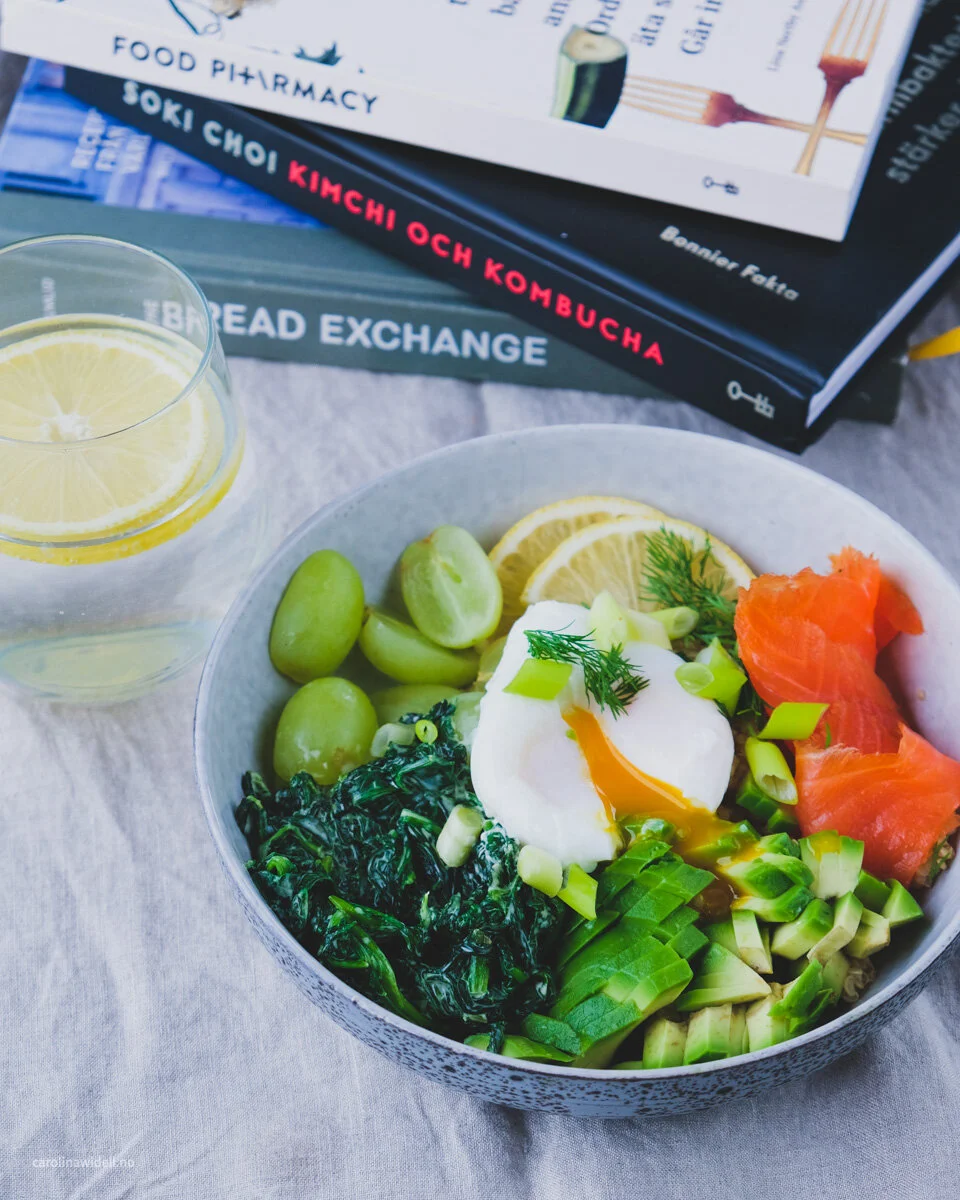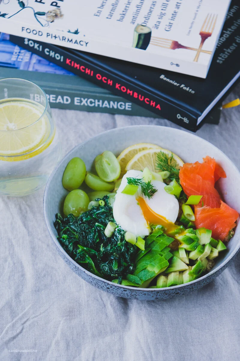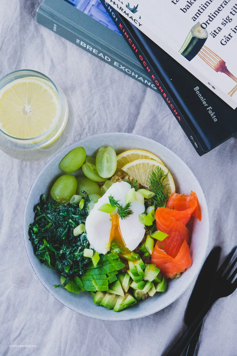 Etter mange dager med ganske mye julemat var jeg klar for noe lettere. Jeg laget en lun brunch bowl med blant annet rester av røkelaks, posjert egg, quionoa og spinat med creme fraiche.