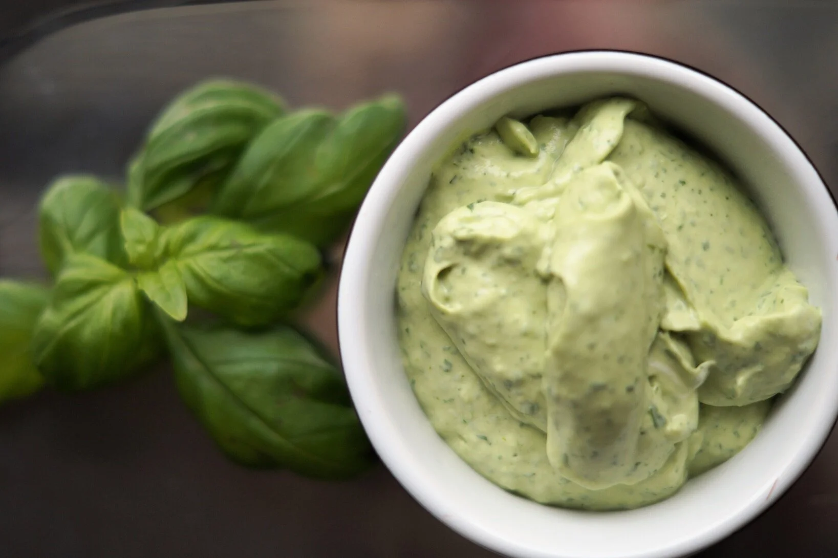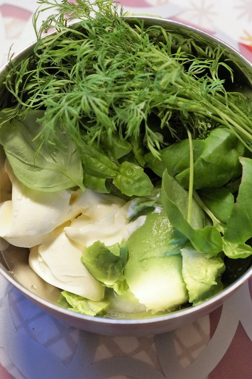 5. Legg alle ingredienser til urte og avokadokremen i en bolle og kjør med stavmiksern til en glatt krem. Smak til med litt salt.