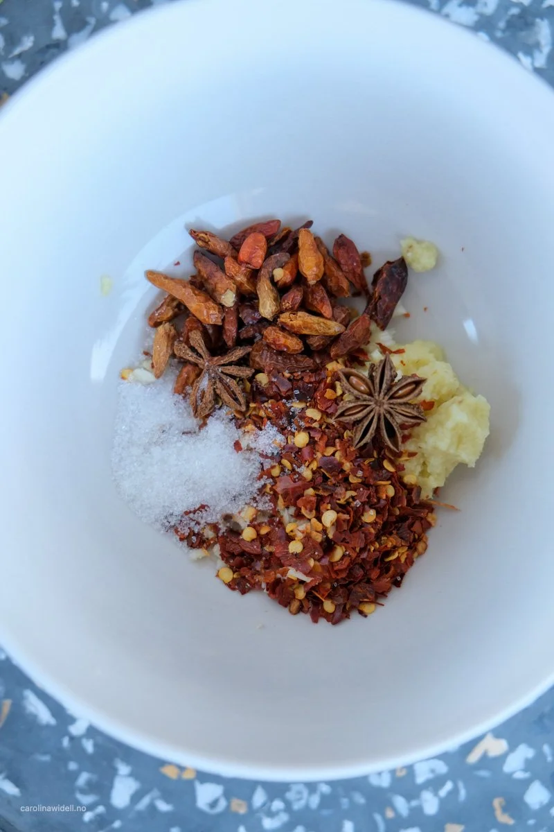 Chiliolje er veldig enkelt å lage selv. Alt man trenger er olje og sterk tørket chili, altså ikke noen pinglete chiliflakes du finner i de vanlige matbutikkene. Her må du gå til f.eks en asiatisk spesialforettning. Jeg brukte også hvitløk, ingefær og litt stjerneanis i min variant.