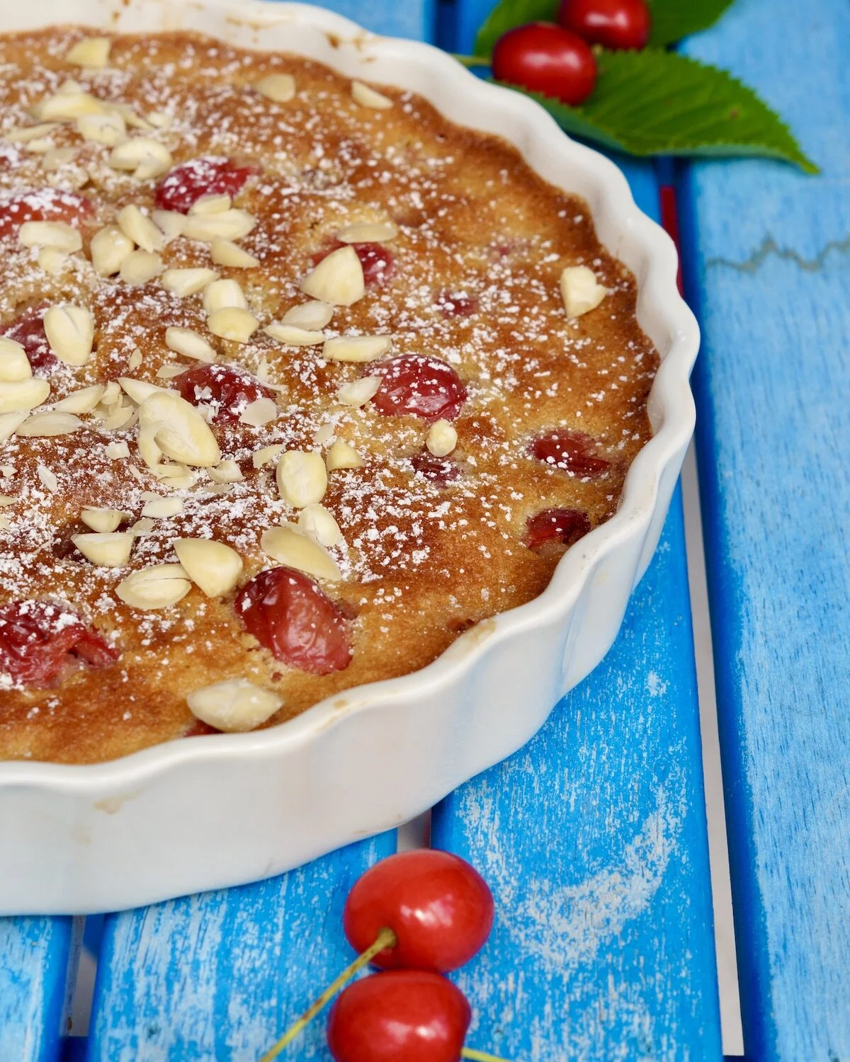 Clafoutis er en fransk dessert med bær. Jeg lagde en luksusvariant med både smør og mandel i. Jeg syns mandel passer veldig fint sammen med moreller som jeg brukte denne gang. Oppskriften kan brukes til alle type bær og det går fint å blande forskjellige typer.