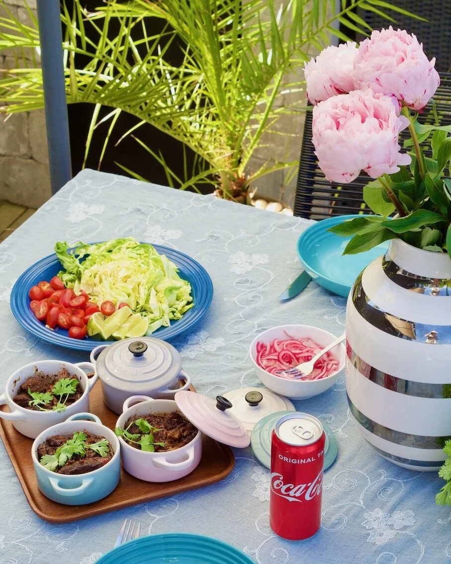 Jeg laget kjøttet en dag i forvei, og det tok 6 timer i ovnen. Men da vi skulle spise, varmet jeg opp kjøttet i disse små søte minigryter fra Le Creuset 15 minutter i ovnen, og serverte sammen med pitabrød og litt grønnsaker. Kjøttet blir faktisk enda bedre etter en dag etter syns jeg, og det var veldig lettvint å servere når det bare var å varme kjøtt i ovnen sammen med pitabrødene.