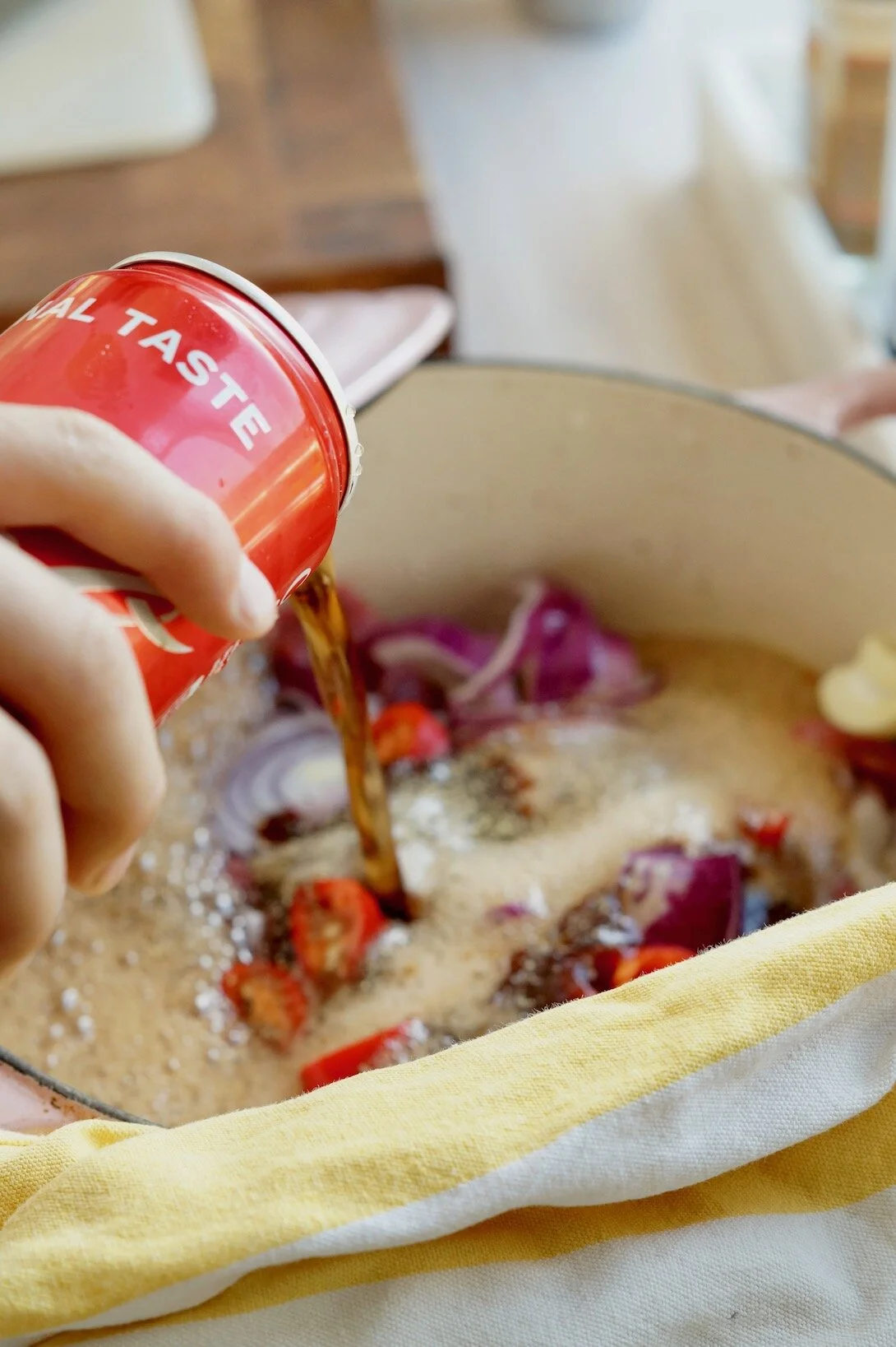 Hell i en boks Coca Cola i gryten med kjøtt, før du setter den i ovnen.