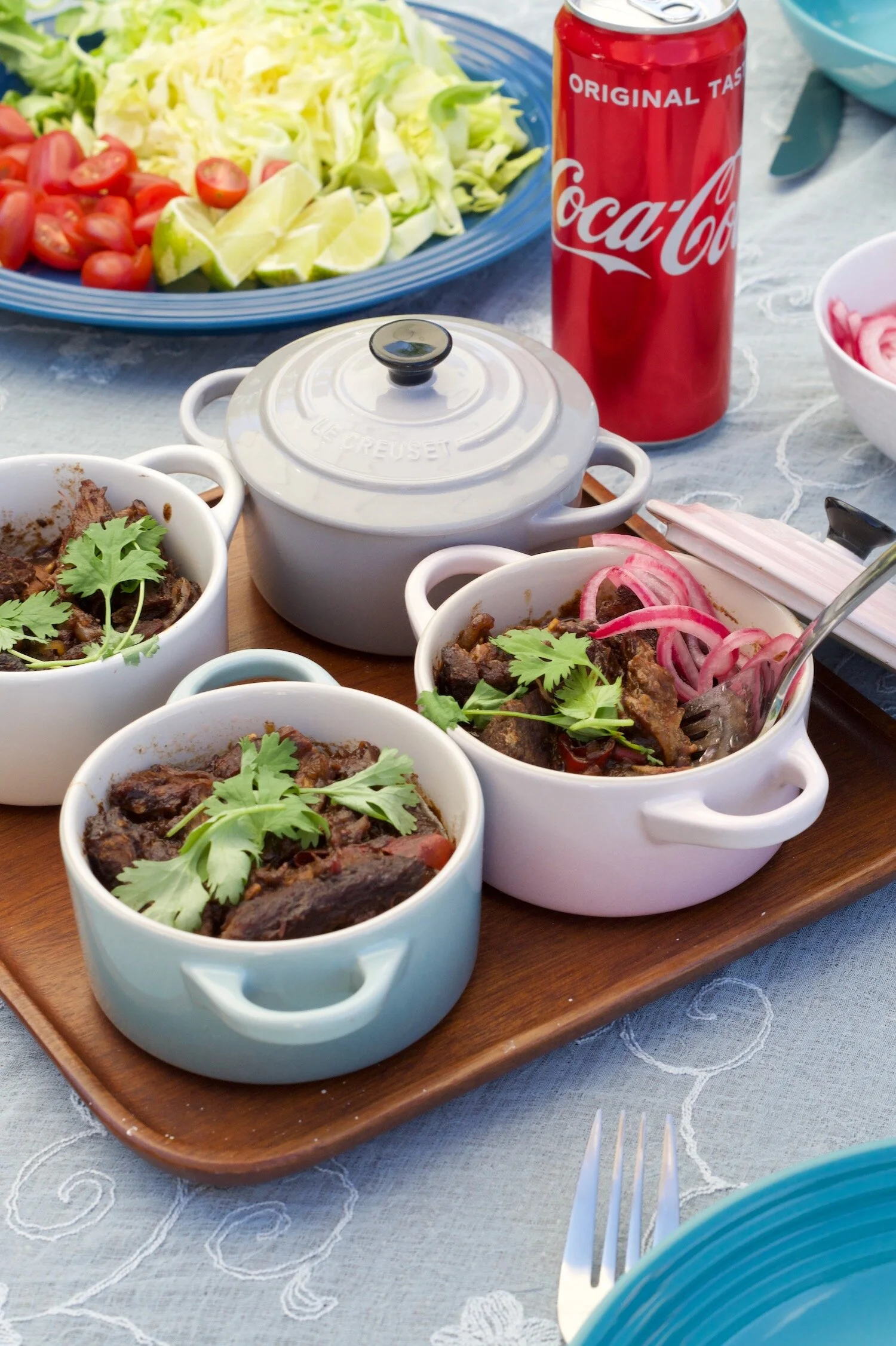 Det å langtidssteke kjøtt i coca cola høres kanskje litt rart ut. Det syntes hvert fall min sønn som var med å laget maten. Men kjøttet får en veldig god smak av colaen. Kjøttet kan minne litt om pulled pork, men jeg drar ikke kjøttet i stykker, jeg kutter det i mindre biter allerede før jeg steker det. Carnitas er for øvrig det sammen som pulled pork, hvis noen lurte på det!