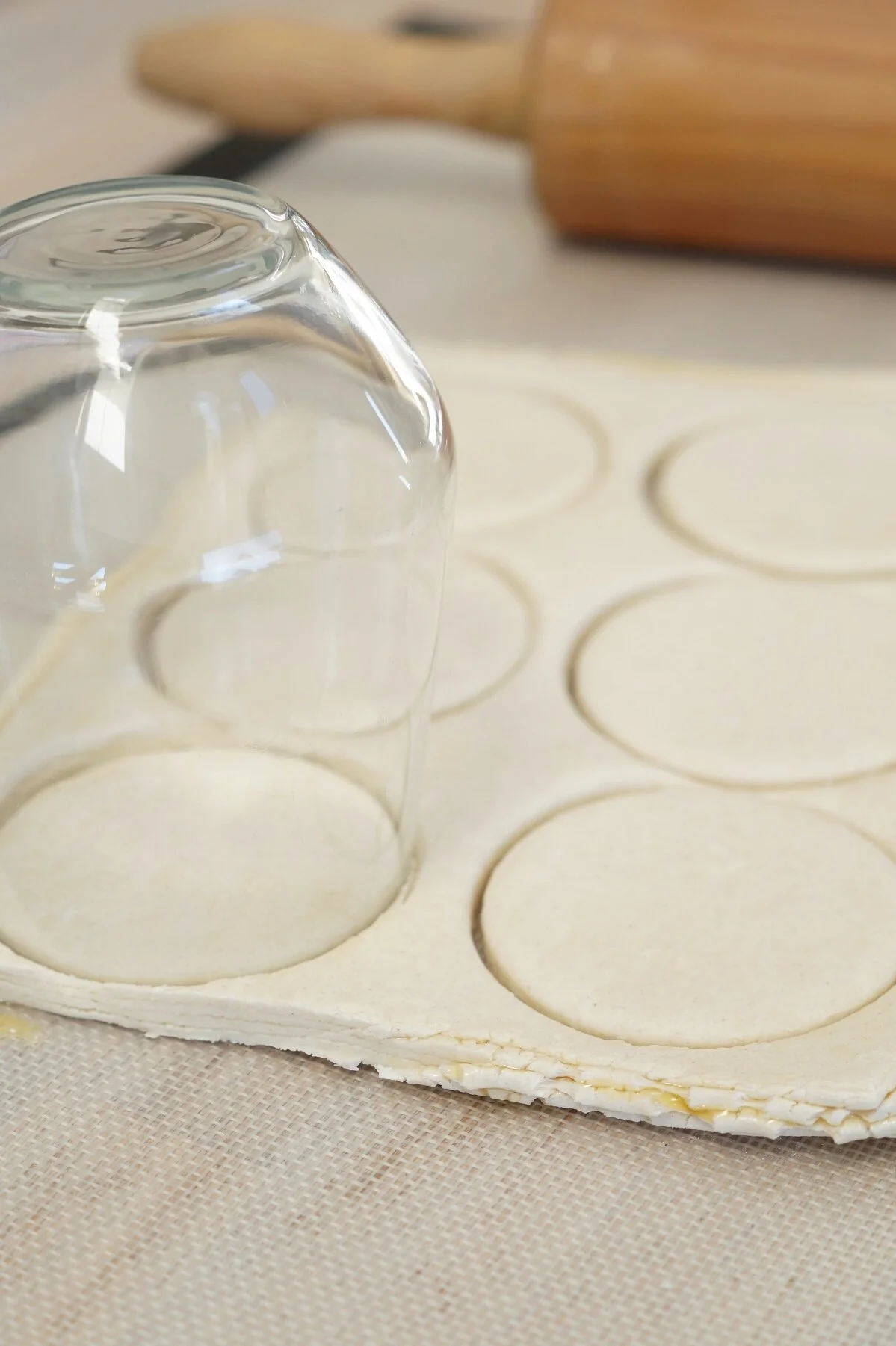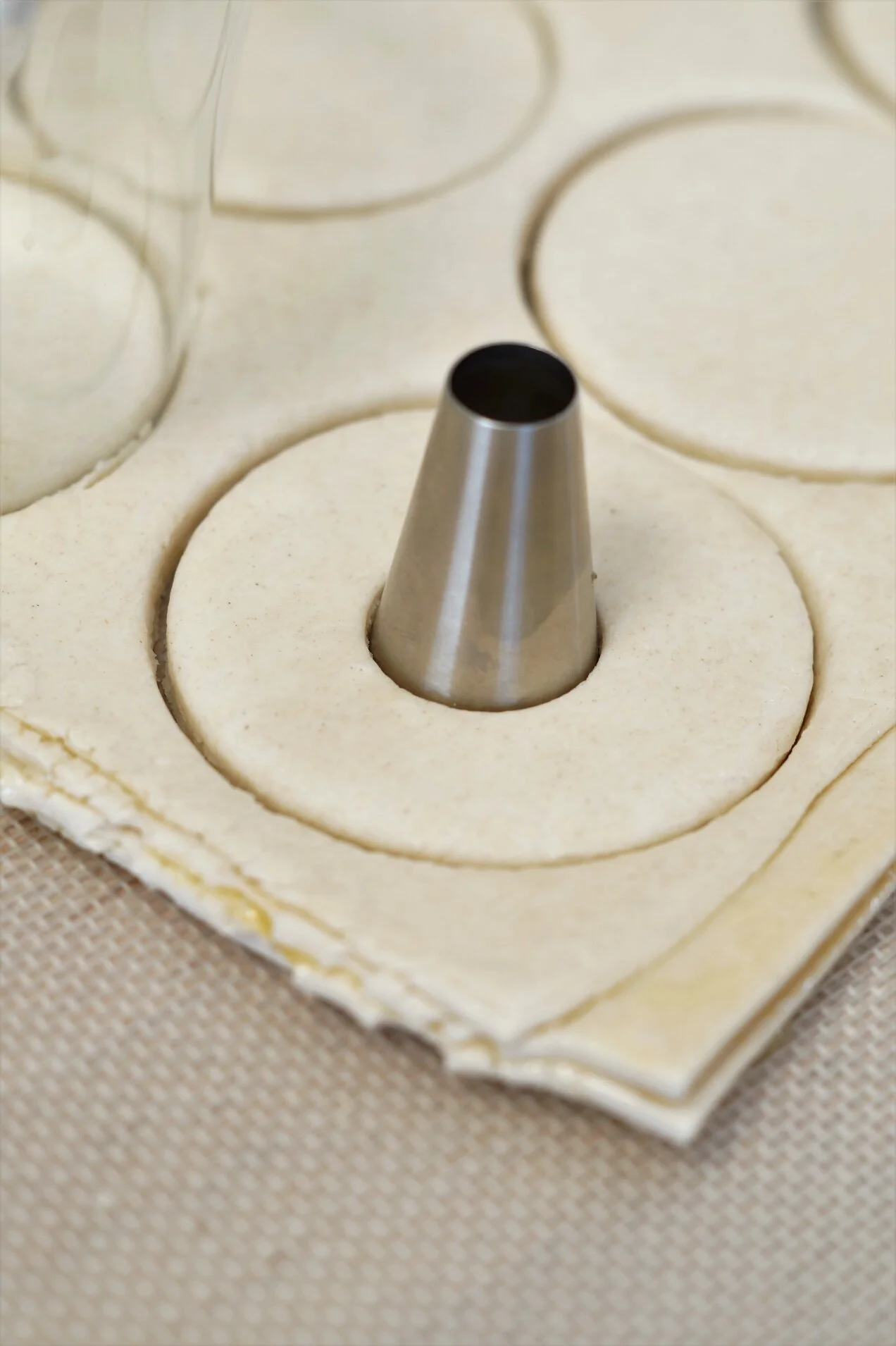 2. Kjevl smørdeigsplatene til dobbel størrelse, og stans ut rundinger med et glass. Jeg brukte en sprøytetip for å lage hullet i midten.