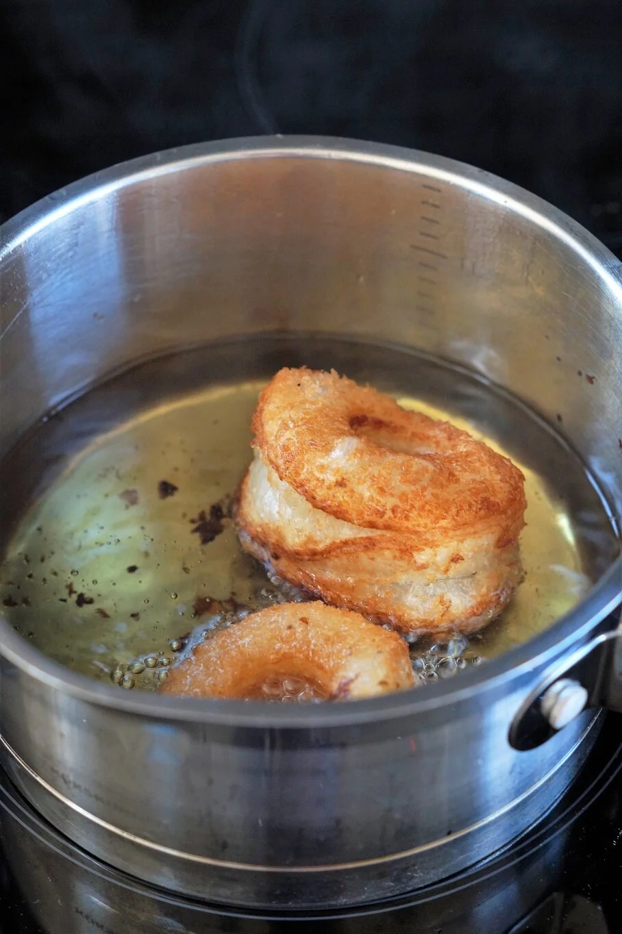3. Varm opp nøytral olje i en liten kasserolle. Prøv å fritere litt av deigen for å se at oljen har riktig temperatur. Legg i cronutdeigen i oljen og snu de etter hvert som de blåser seg opp.