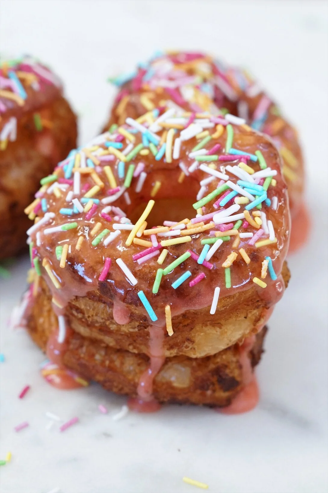 Hvis en doughnut og en croissant hadde fått et barn, så hadde det blitt en cronut. Jeg bestemte meg for å teste, men i alle oppskrifter jeg så på måtte man lage selve deigen fra scratch. Men jeg vet jo at man kan kjøpe ferdig crosisantdeig, så jeg skjønte ikke hvorfor ikke man bare kunne bruke den. Det testet jeg i hvert fall, og resultatet ble helt strålende! Luftige, crispy cronuts på nulltid! Det ble faktisk et veldig hyggelig biprodukt også, når jeg laget disse. Nemlig churros. Da jeg stanset ut cronutsen friterte jeg også deigen som var igjen, og drysset det med sukker og kanel. De ble til superluftige churros. Så dette kan man si, er to oppskrifter i en.