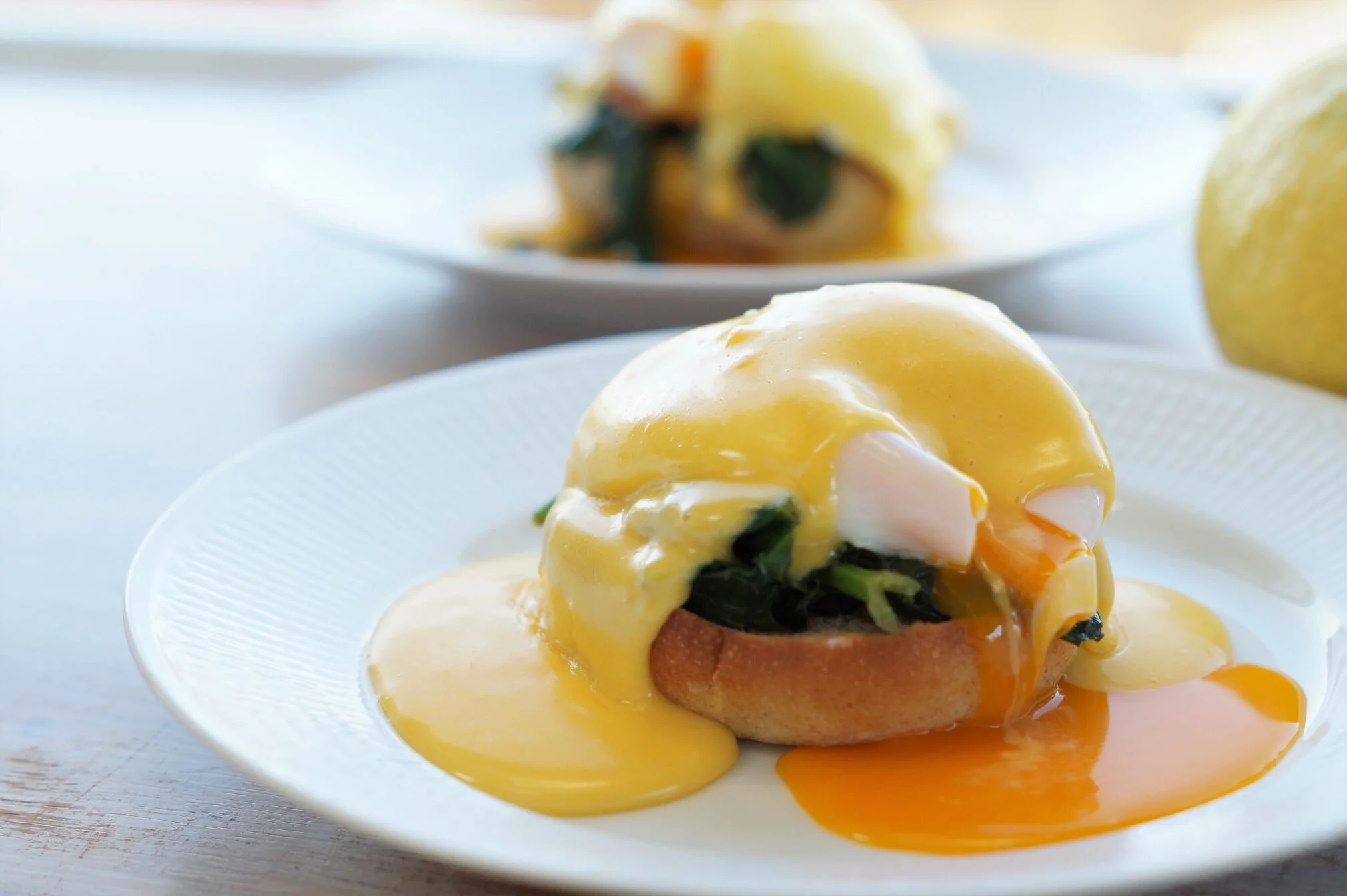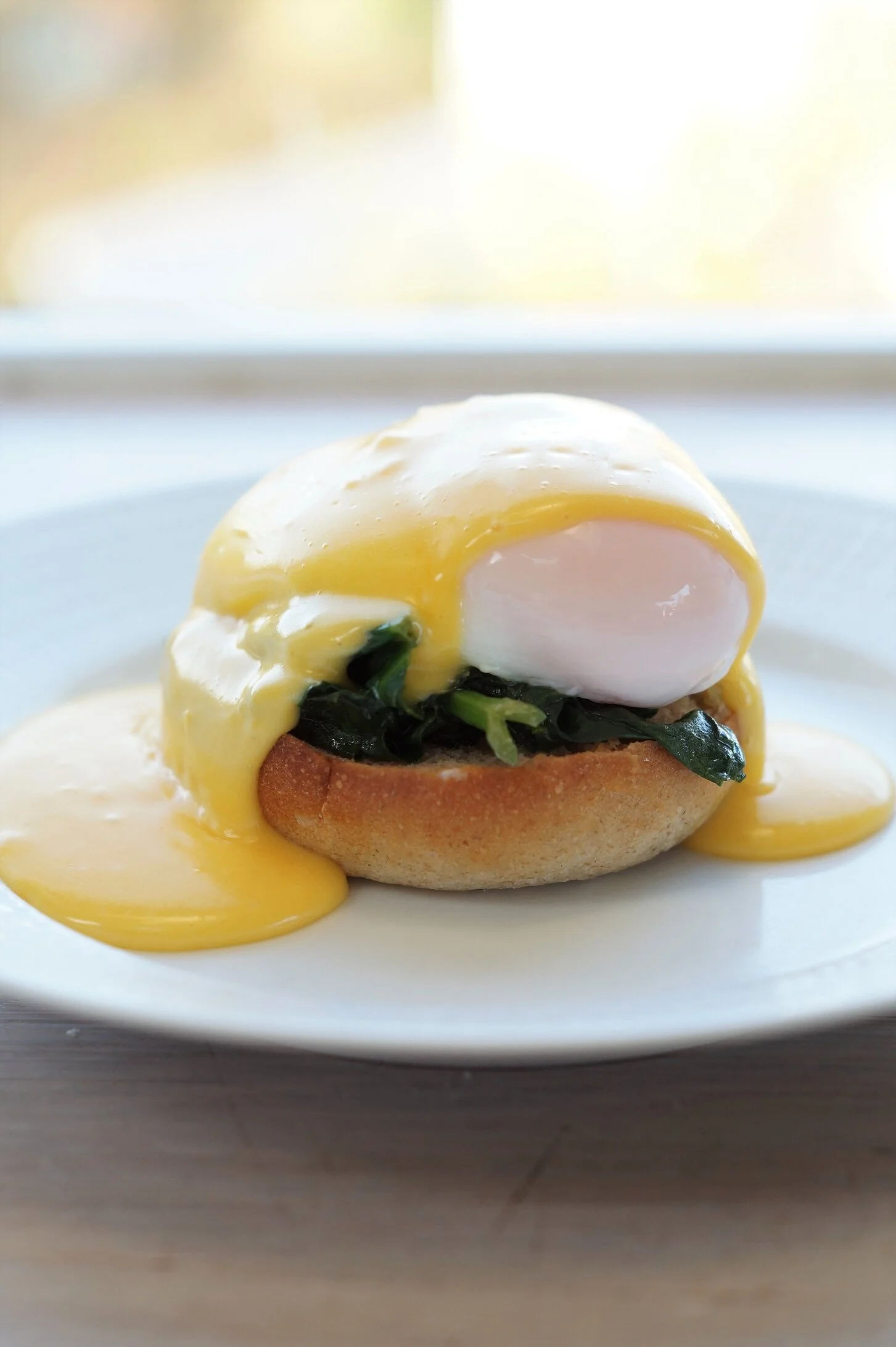 3. Posjer eggene og legg de på spinaten og laksen. Topp med en generøs mengde hollandaisesaus.