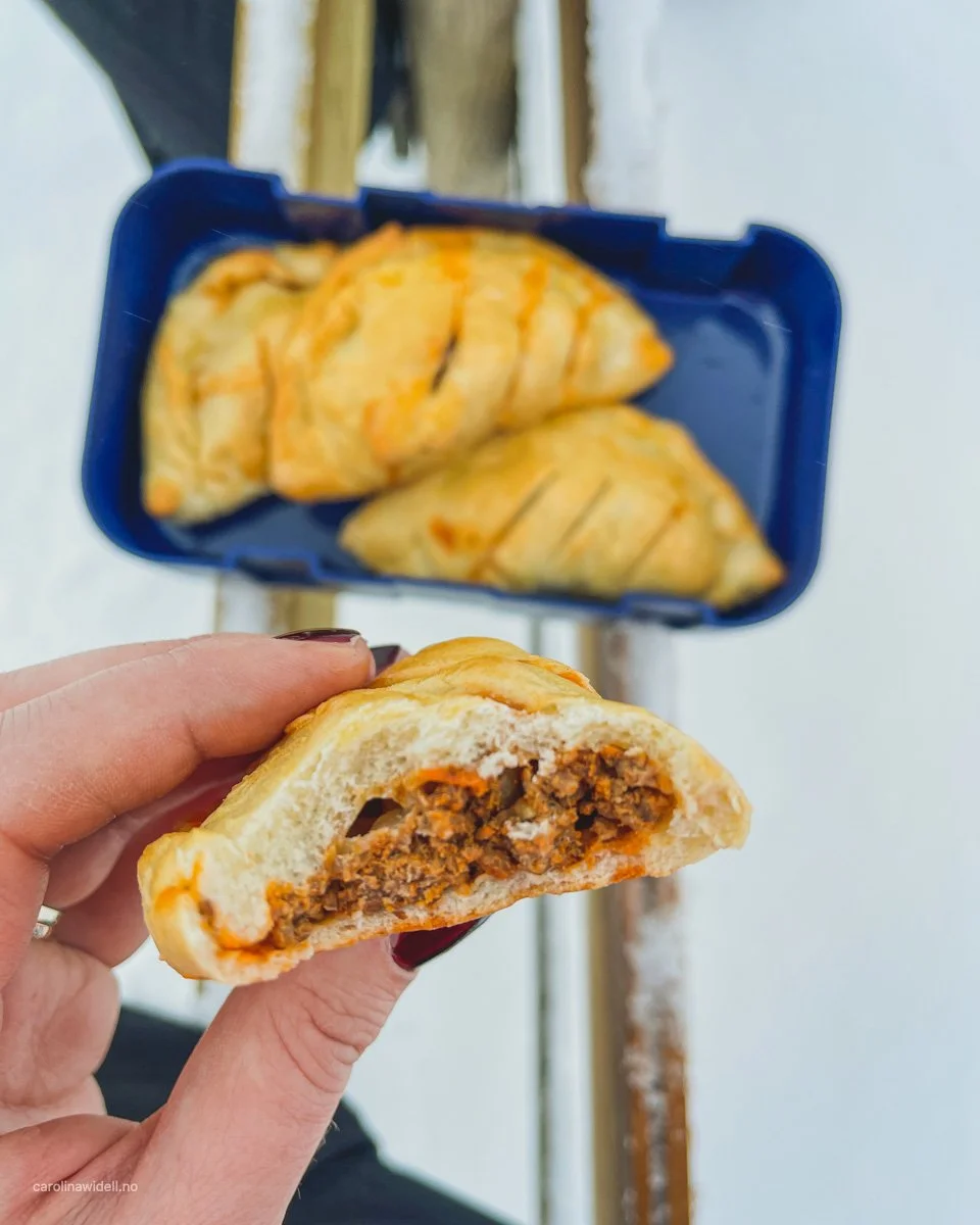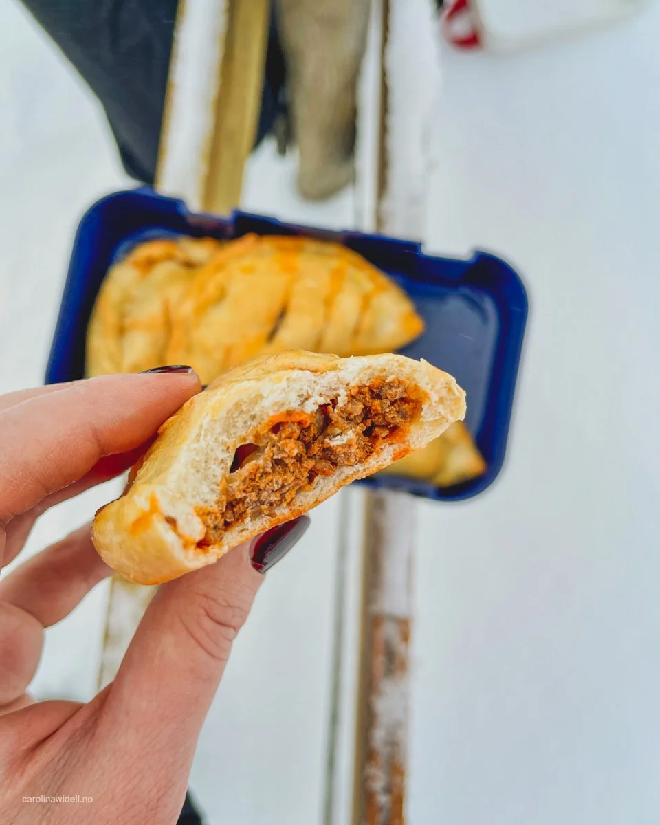 I går skulle vi egentlig stått på ski, men tydeligvis vokser barns føtter med 3 størrelser pr sesong så vi hadde ingen skisko som passet, så vi dro til akebakken isteden. Jeg hadde laget empanadas dagen før. Empanadas er perfekt turmat, og de er like gode å spise kalde som varme. Dette er en barnevennlig versjon som ikke er så mye krydder i. Man kan selvfølgelig bruke mye mer krydder hvis man vil det.