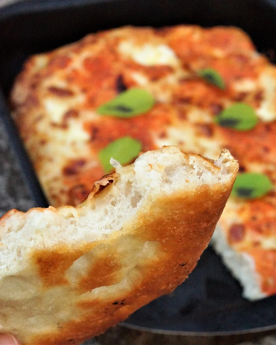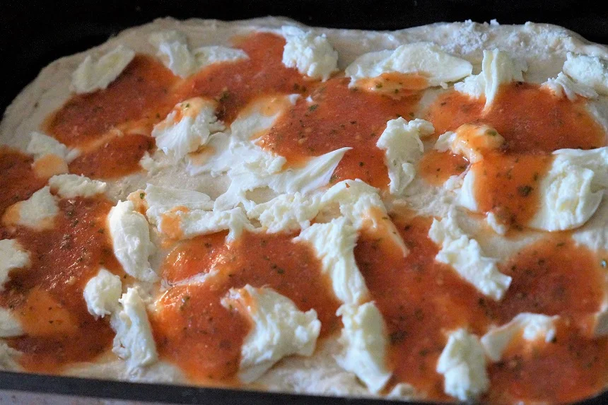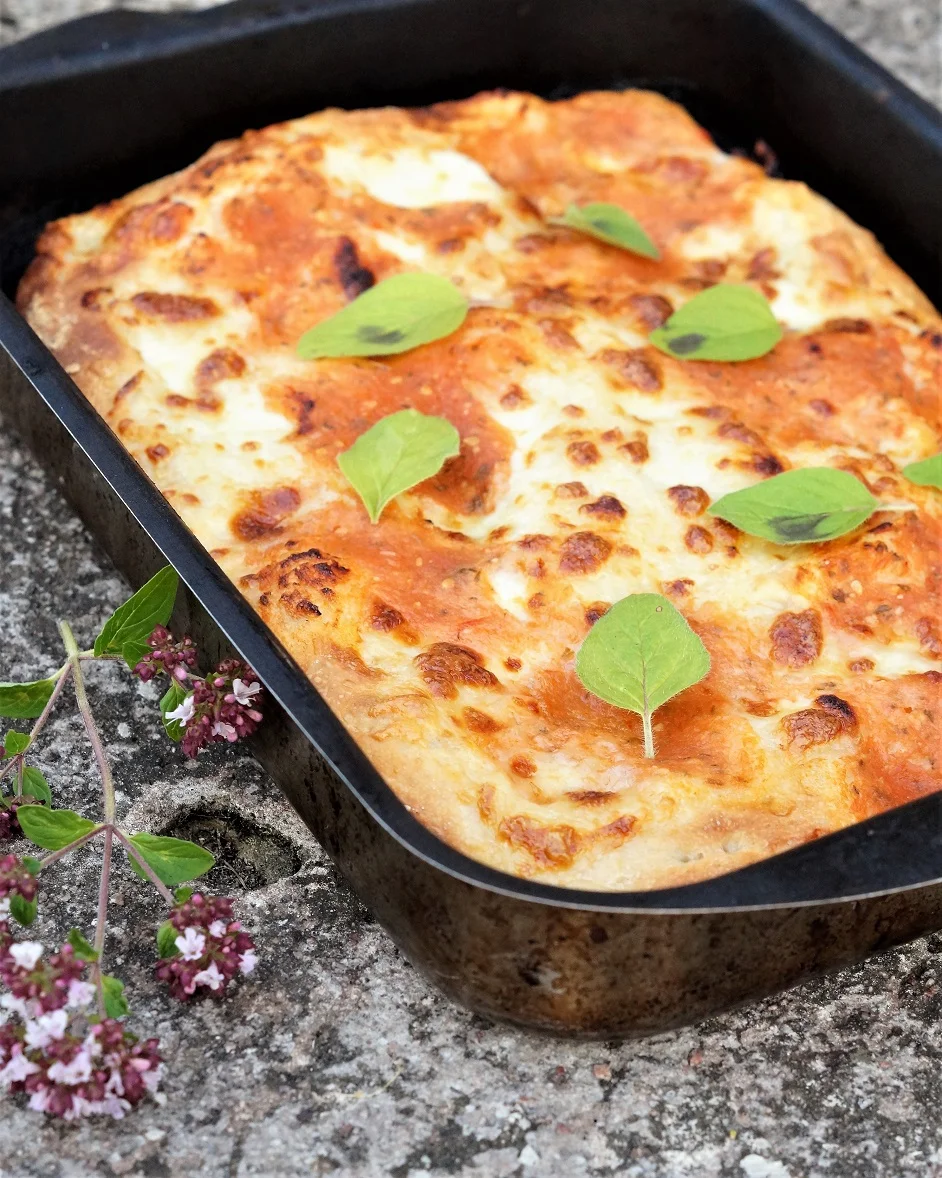 Grandma style pizza er en slags blanding mellom pizza og et focaccia-lignende brød. Bunnen er tykk og bakt i en form dekket med olje i bunn, slik at den blir sprø. Deigen skal helst heve lenge i kjøleskapet. Jeg lagde en klassisk margeritatopping, med mozzarella og en tomatsaus laget på friske tomater. Til forskjell fra vanlig pizza skal tomatsausen helles over osten istedenfor omvendt.