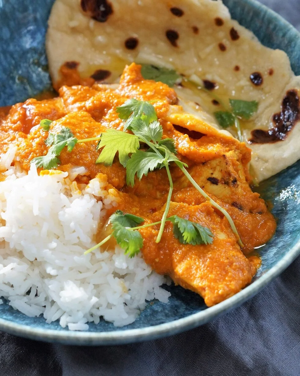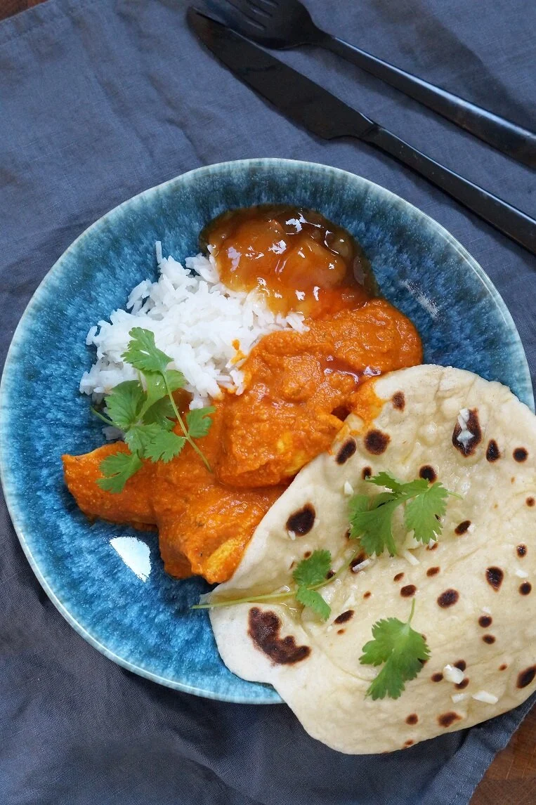 5. Legg kyllingbitene i sausen og la det koke sammen til at kjøttet er gjennomstekt. Smak til salt, sukker (veldig viktig for balansen) og eventuelt mer chili. Server med nylagede naan-brød, ris og koriander.
