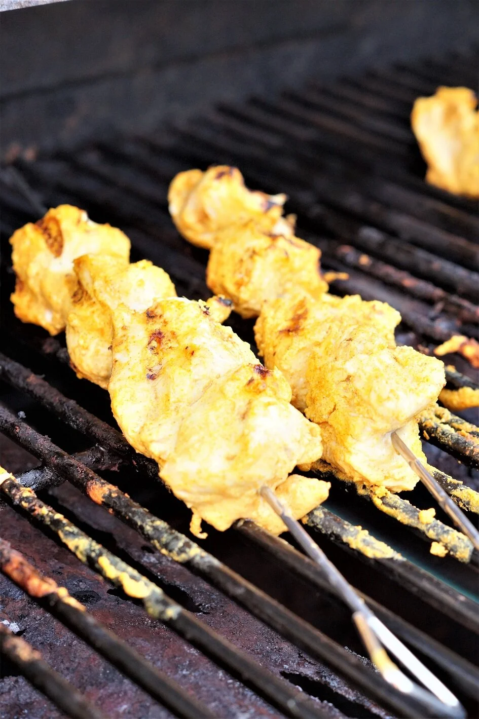 4. Tre kyllingbiter på spydd og grill de. De trenger ikke være gjennomstekt, kun få farge og smak fra grillen.