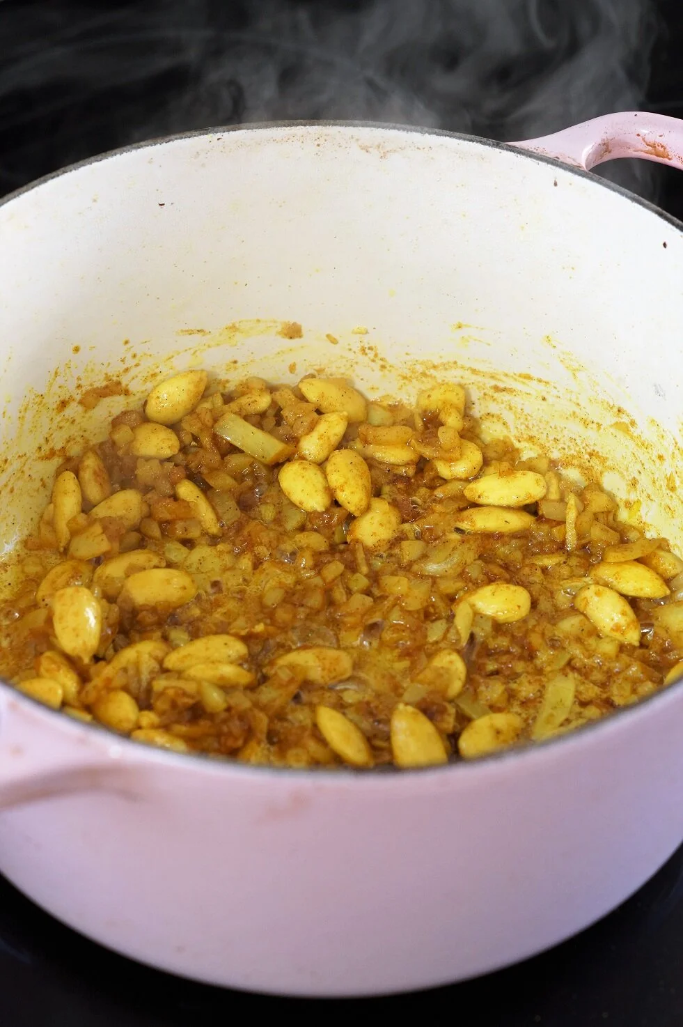 2. Kok opp mandlene raskt slik at du kan fjerne skallet. Det fikk jeg faktisk min to-åring til å hjelpe meg med, imens jeg hakket løk og hvitløk til sausen.