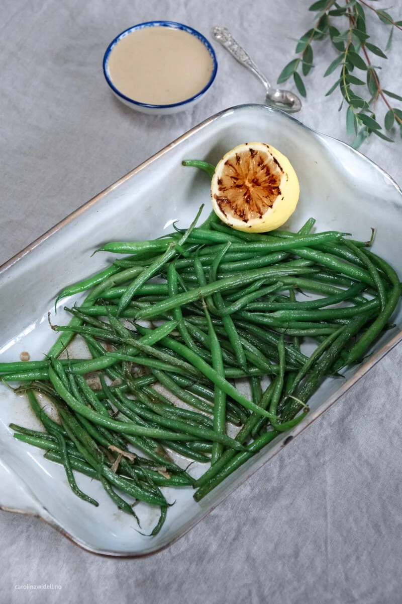 Haricot verts og kylling med tahinidressing