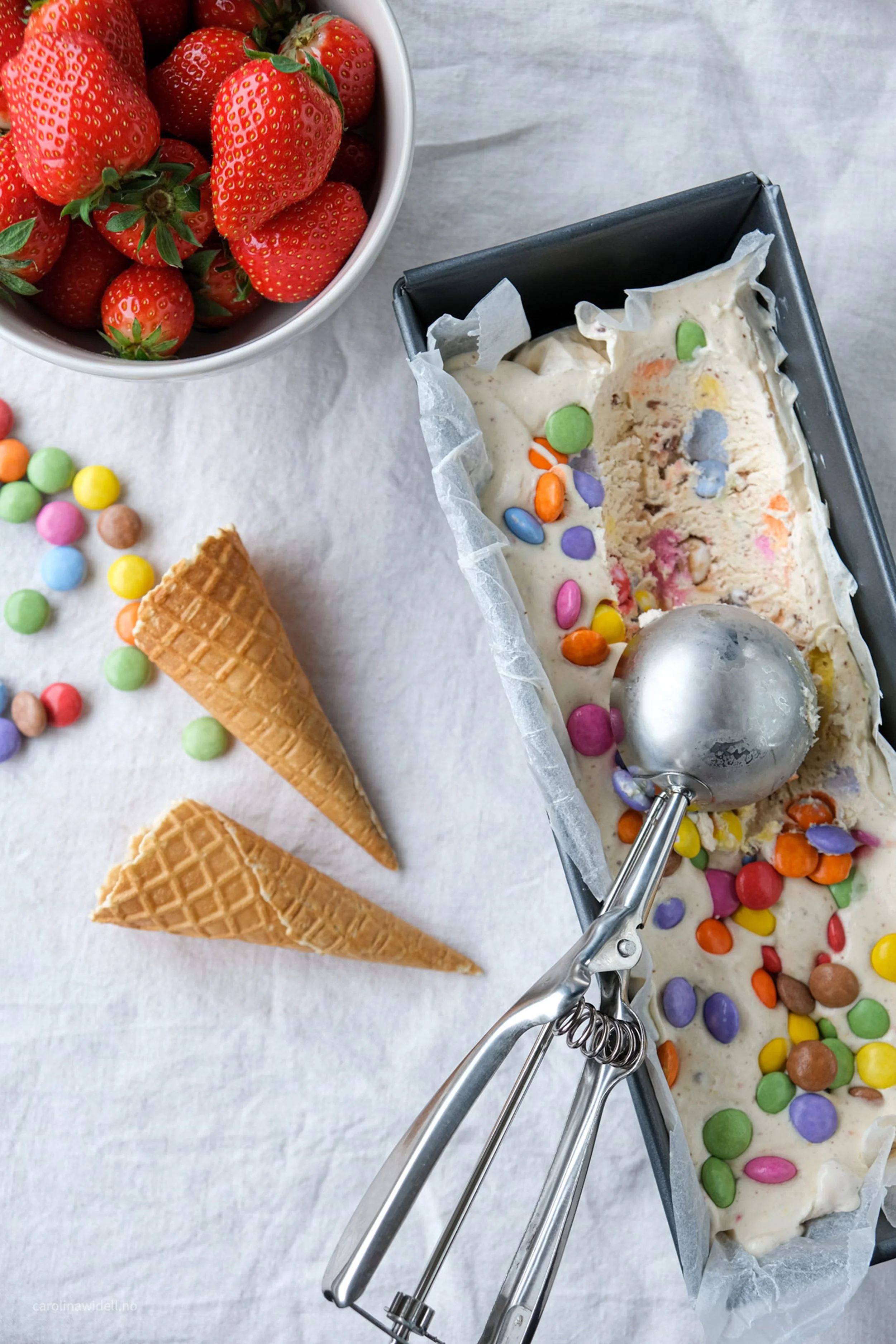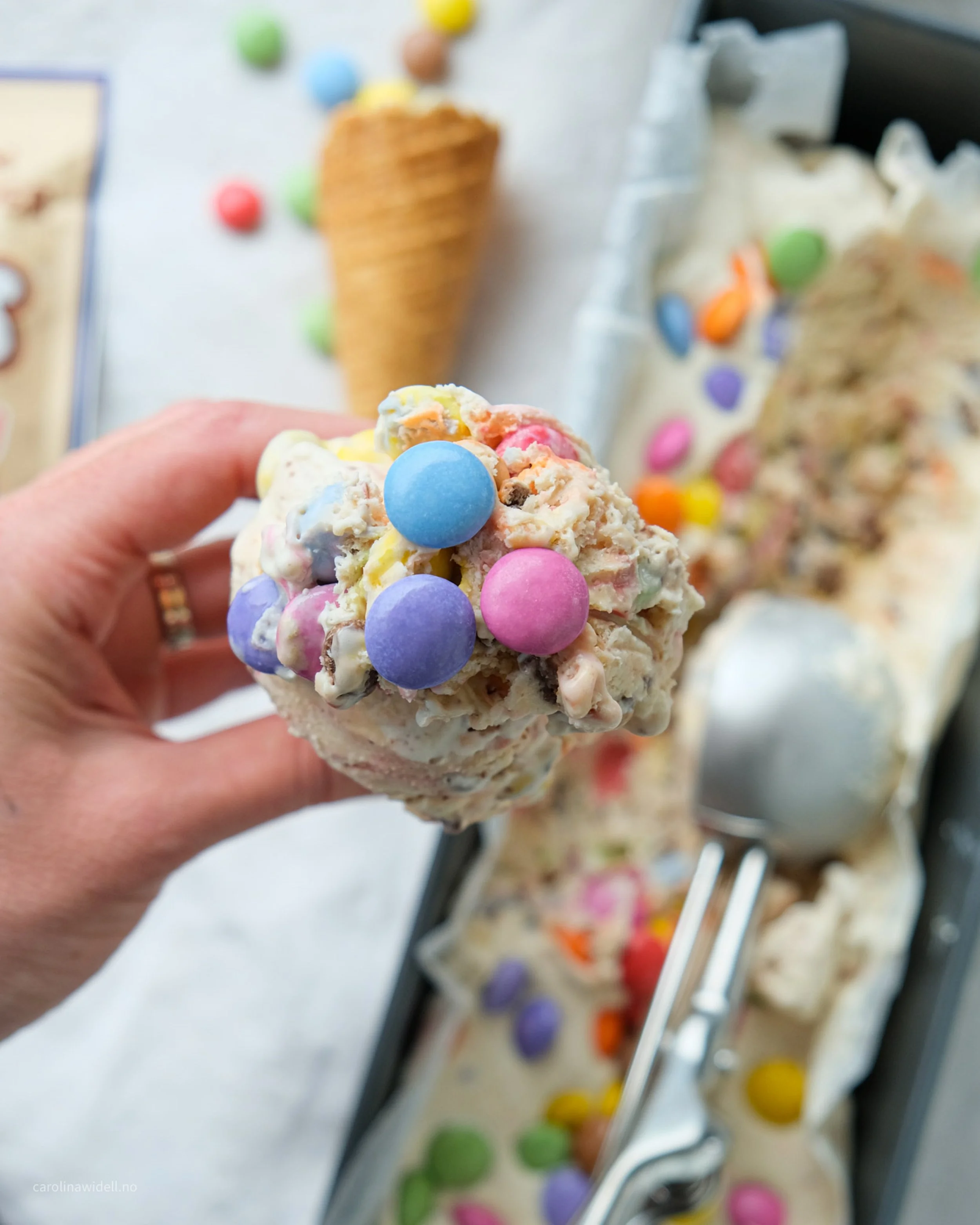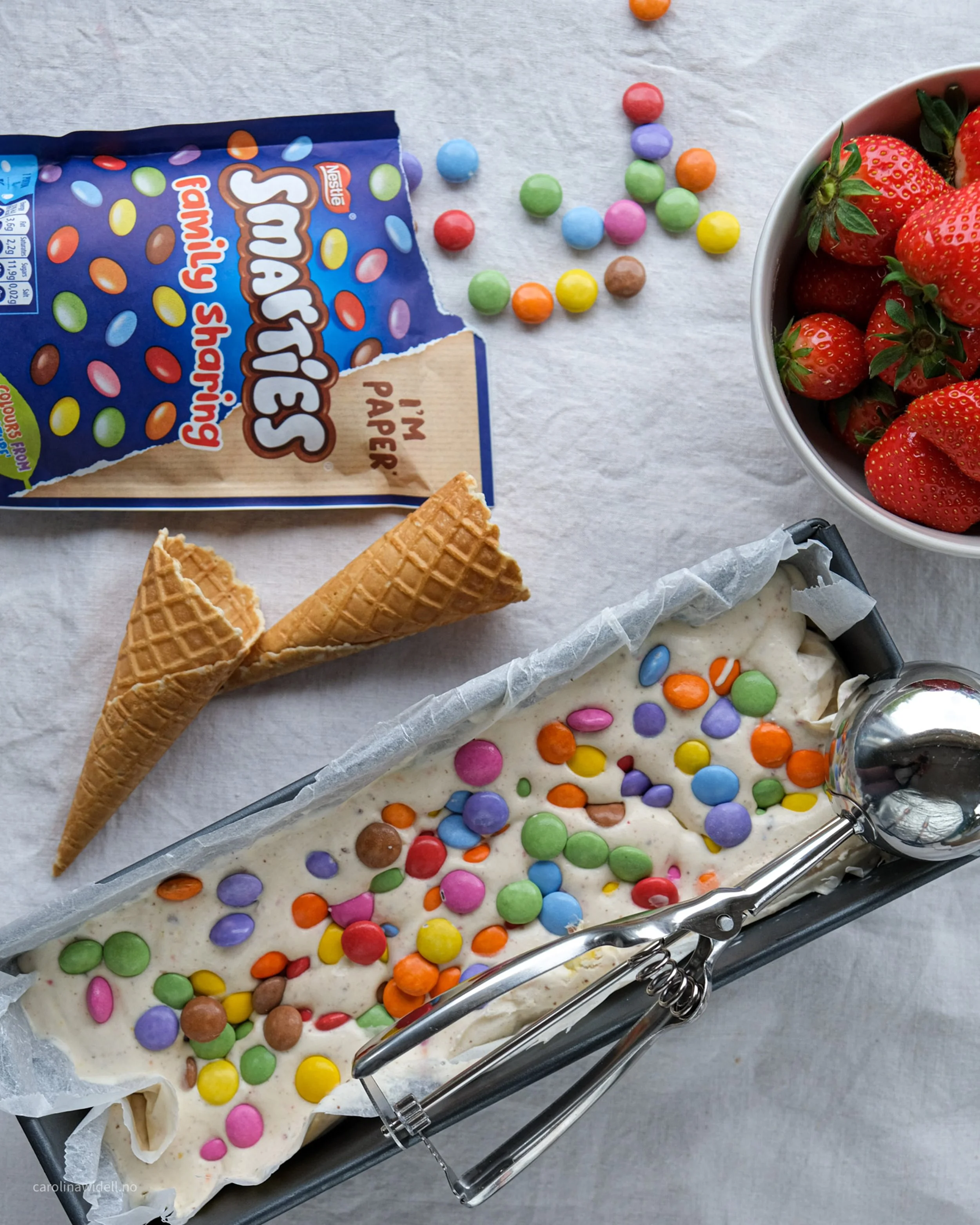 Nå er det 17 mai om litt, og jeg har allerede laget isen jeg (og barna😏) skal spise. Den her isen er superenkel å lage, kun 2 ingredienser (hvis du ikke teller smartiesene da) og man trenger ikke ismaskin, isen blir kremete og luftig allikevel.