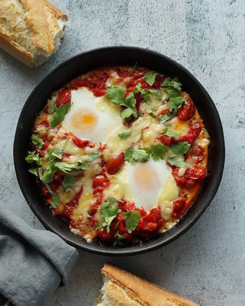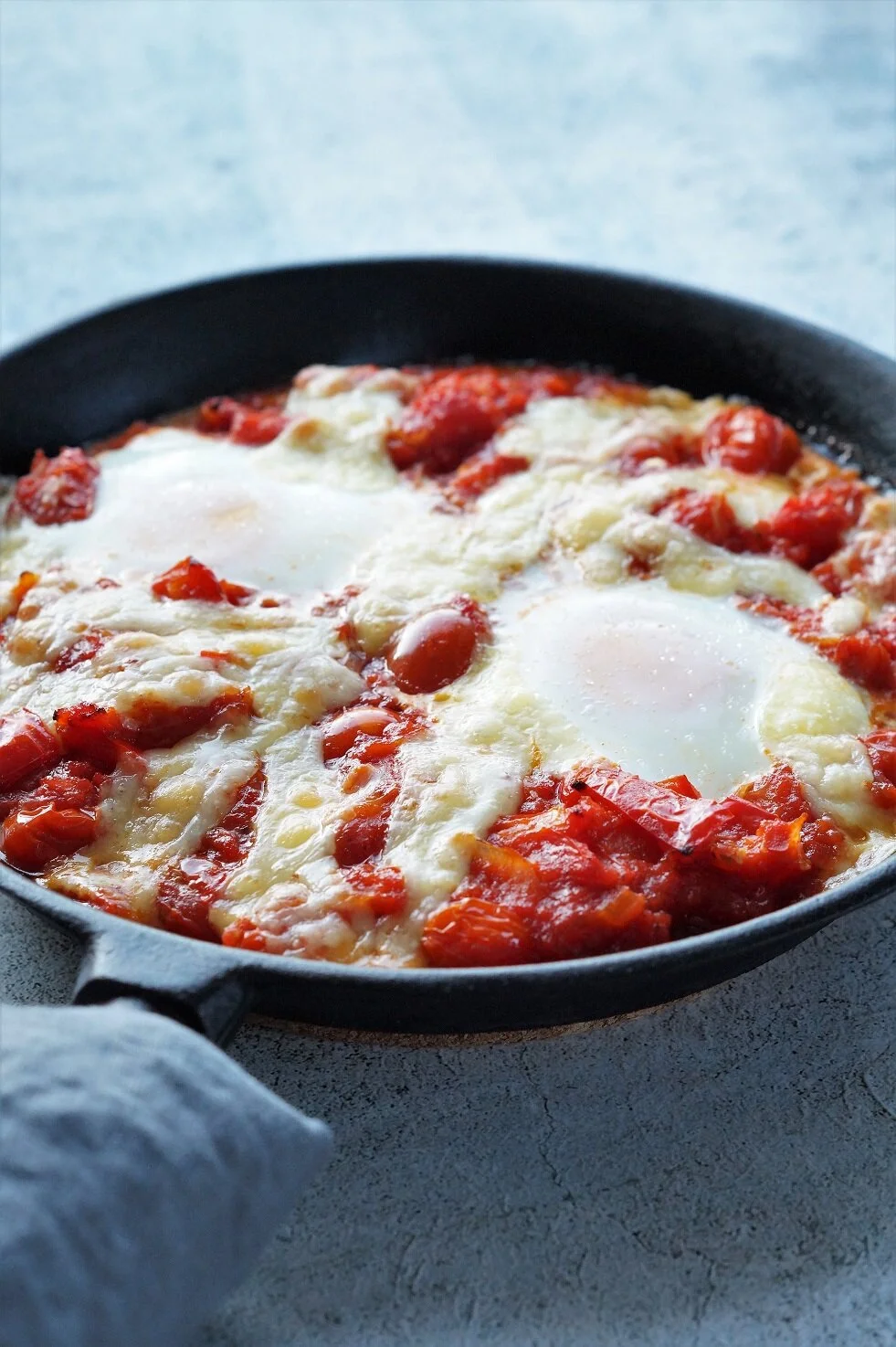 5.Ha tomatsausen i en ildfast form eller i en støpejernpanne. Lag 2 hull i tomatsausen og klekk eggene i hullen. Dryss over revet ost.