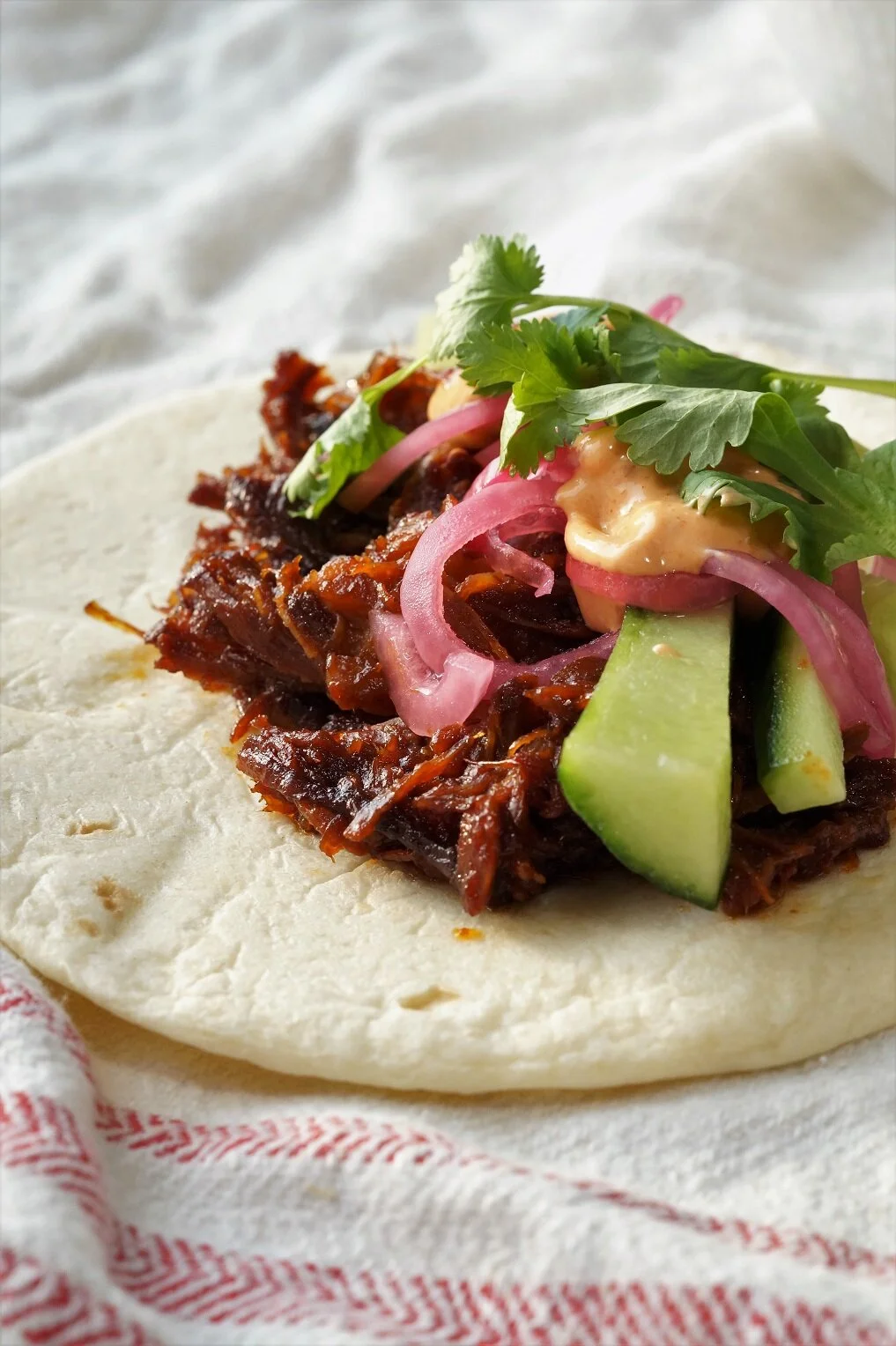 Skal jeg være helt ærlig hadde jeg tenkt å lage helt vanlig pulled pork, men så glemte jeg kjøttet inne i ovnen litt for lenge. Nesten all væske fordampet, og sukkeret som er i BBQ sausen og chilisausen karamelliserte kjøttet. Det viste seg å bli det beste pulled pork jeg noensin spist! Derfor deler jeg oppskriften her.