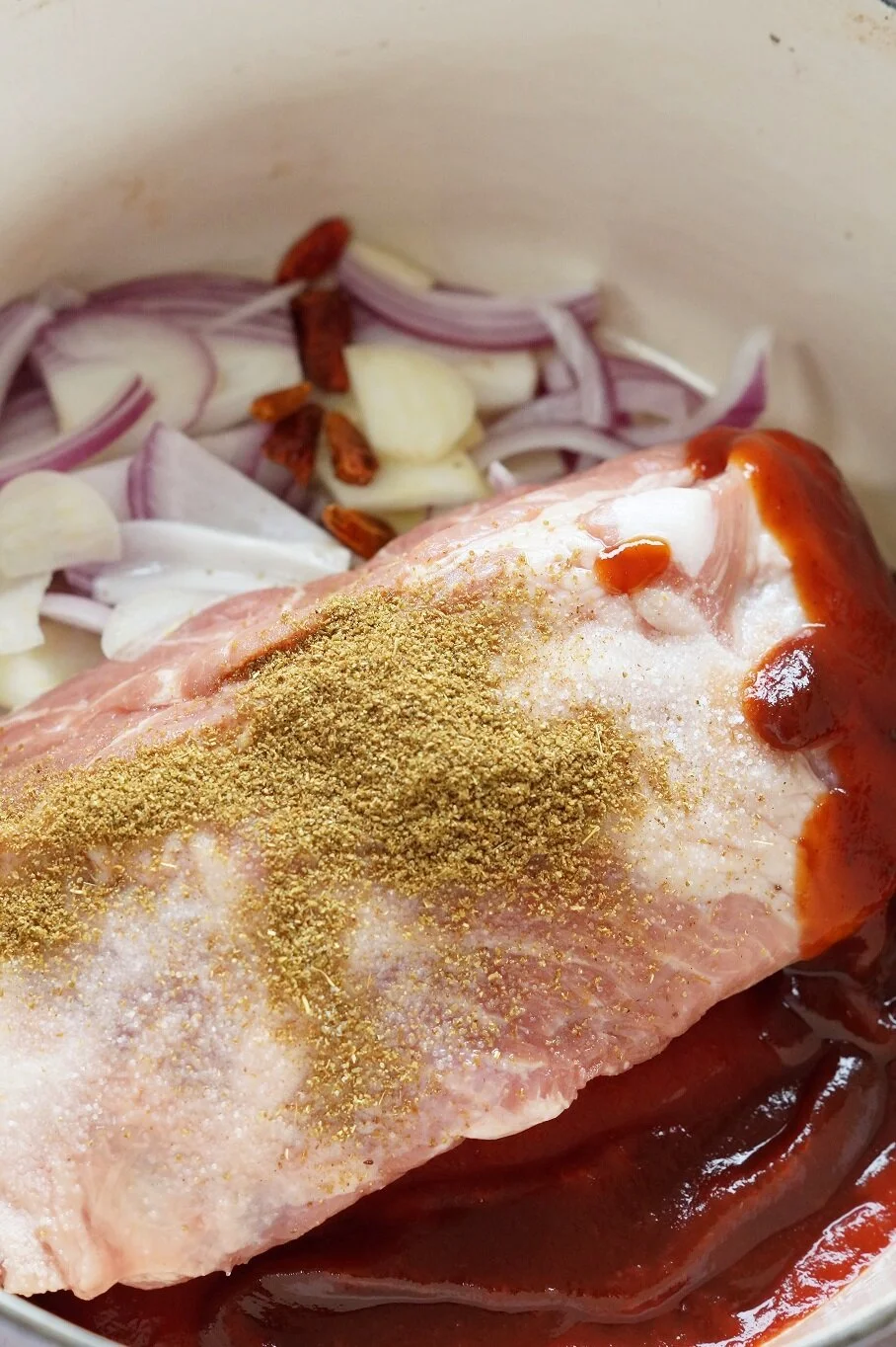 2. Kutt løk og hvitløk i biter, og legg det i gryten sammen med kjøttet. Hell over Heinz chilisaus, BBQ saus, sitronsaus, salt, spisskummen og chili. Bland slik at kjøttet blir dekket.