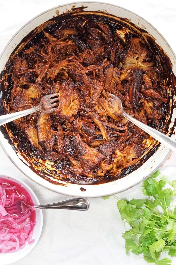 3. Sett hele gryten i ovnen, med lokk på, i 130 °C. Etter ca 2 timer, når kjøttet har begynt å falle fra hverandre, tar du ut gryten og drar kjøttet fra hverandre med to gaffler. Bland godt slik at alle biter dekkes av sausen.