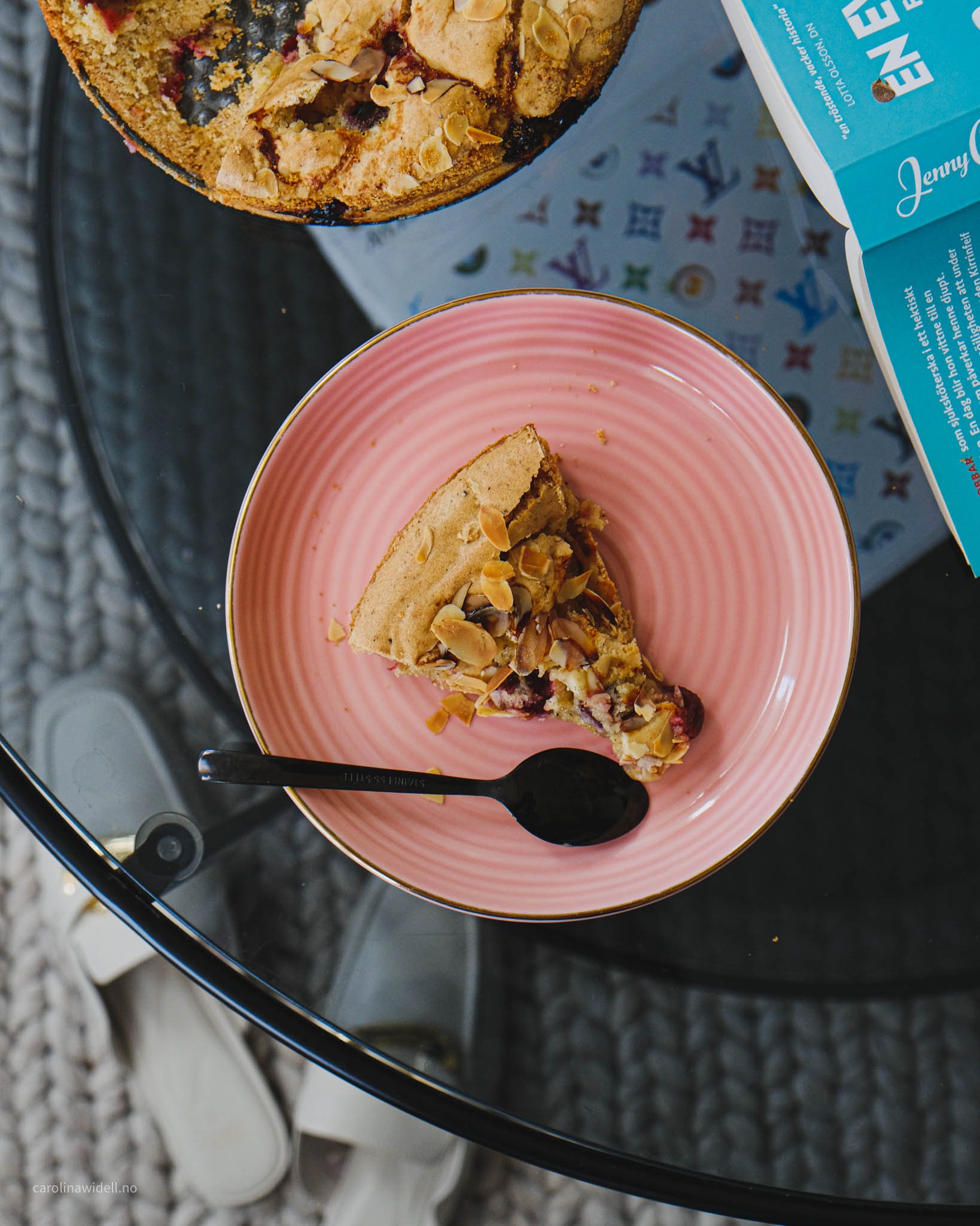 En litt klissete kake med mye smak av kardemomme. Jeg brukte frosne kirsebær men man kan også bruke f.eks bringebær hvis man ikke har kirsebær.