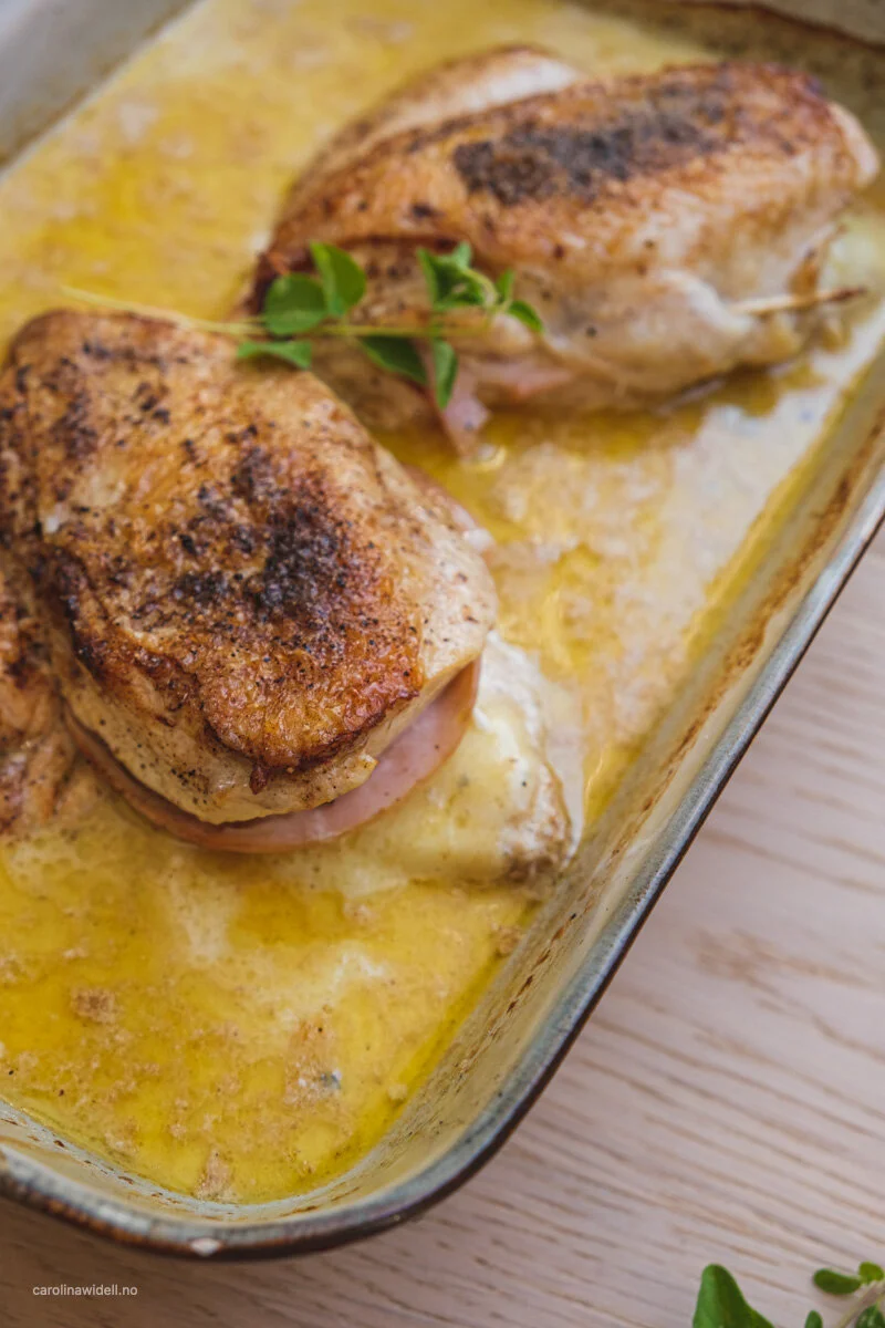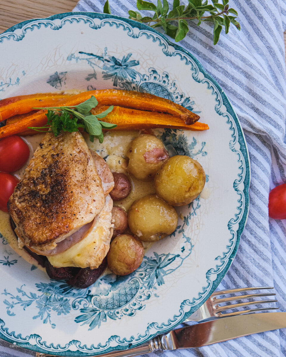 Dette er en variant av Cordon Bleu, men den er ikke helt lik originalen. Jeg serverte den med deilige norske rotgrønnsaker i sesong og en smakrik saus med litt blåmuggost.