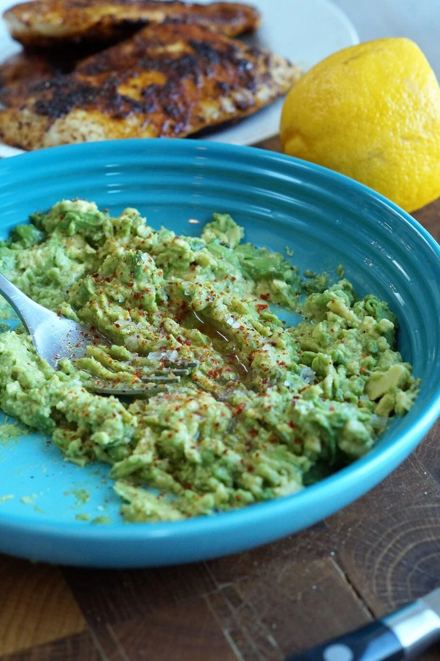 2. Mos en avokado, sammen med saften av en halv liten sitron, litt salt og evt chiliflakes.