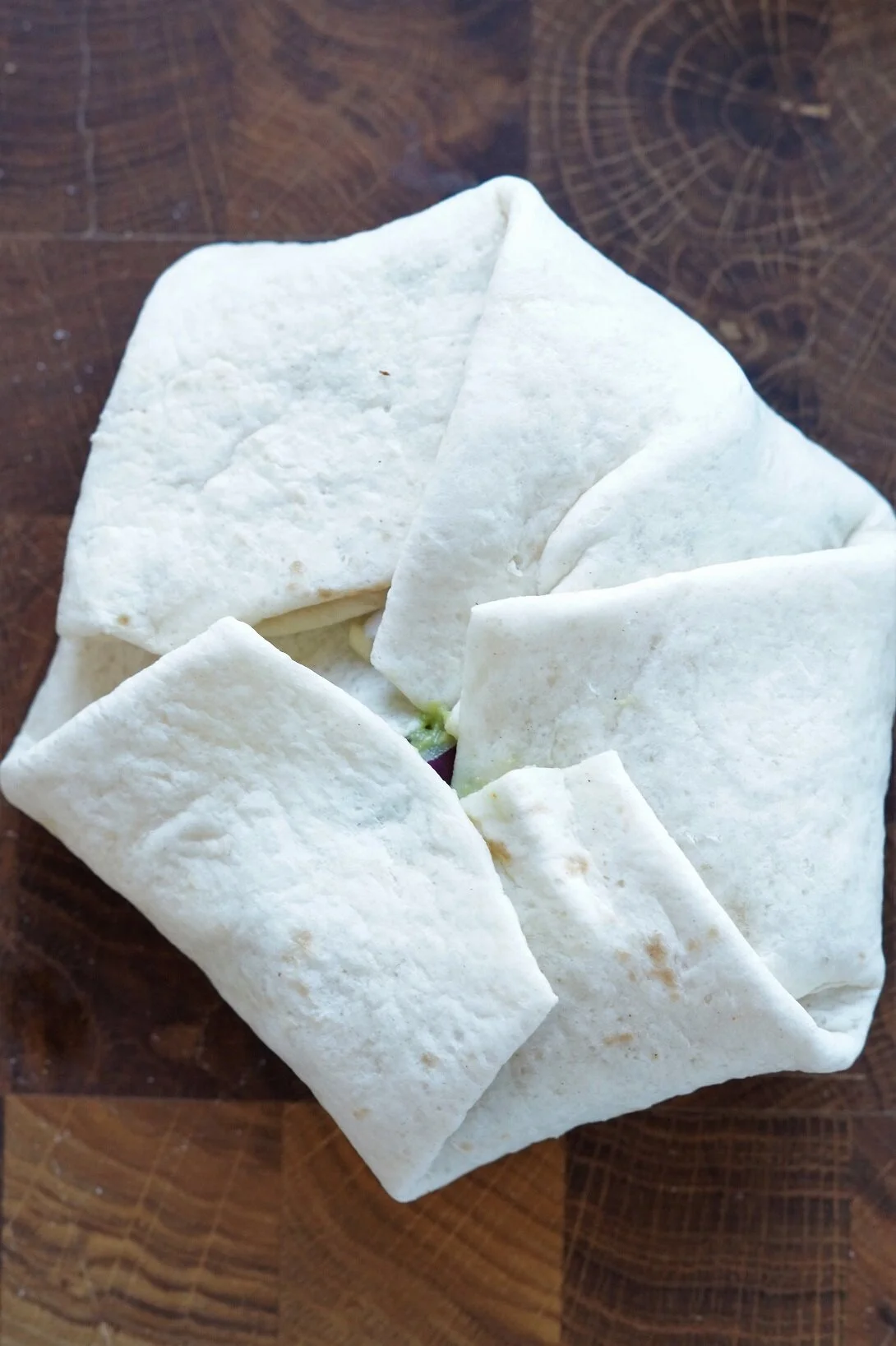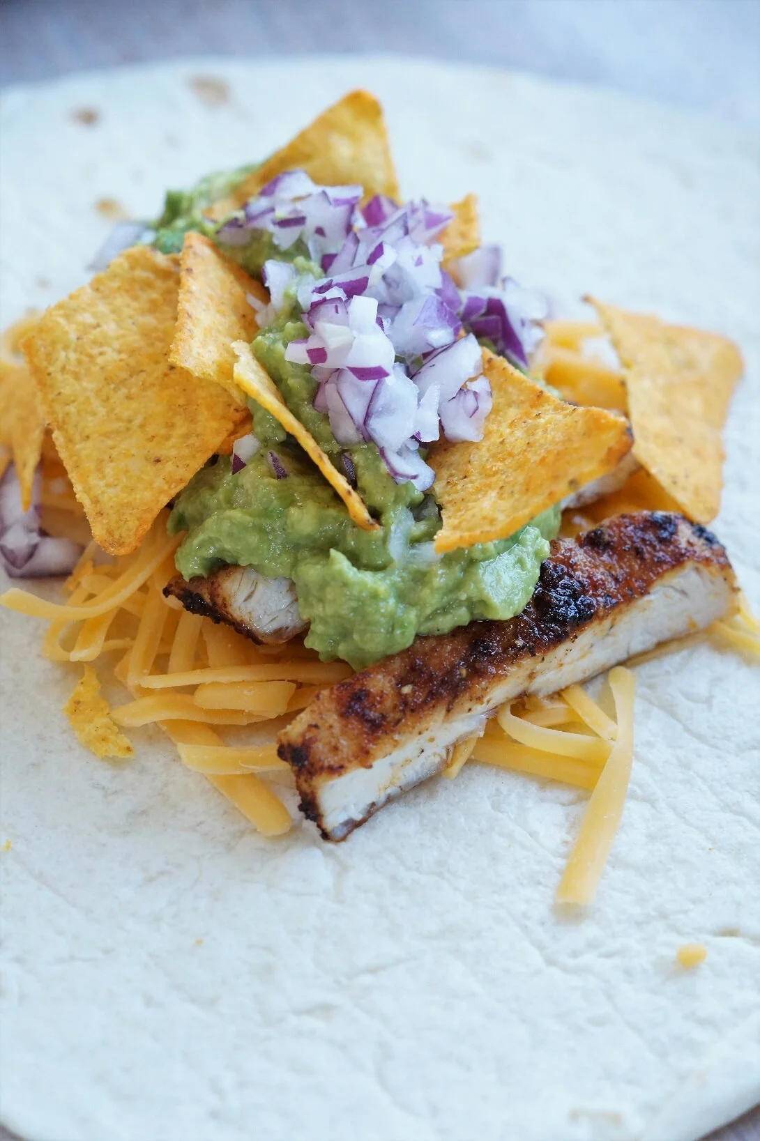 3. Legg ost, kylling, avokado, nachos og rødløk i midten av et tortillabrød. Brett tortillaen til en sekskant, se bilde. Det kan være lurt å ha chipsen i litt mindre biter slik at de ikke stikker hull i tortillaen når du bretter den.
