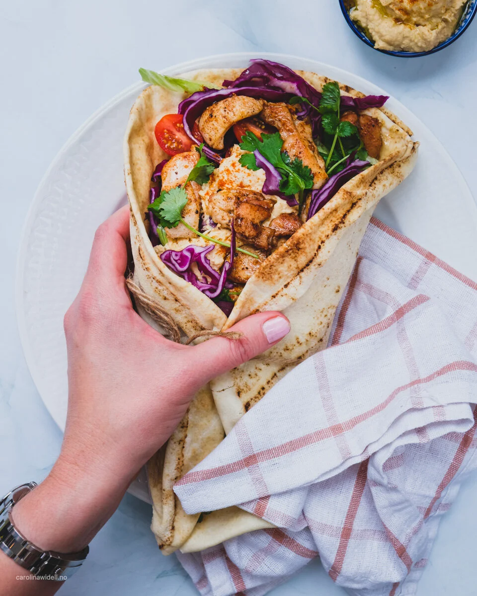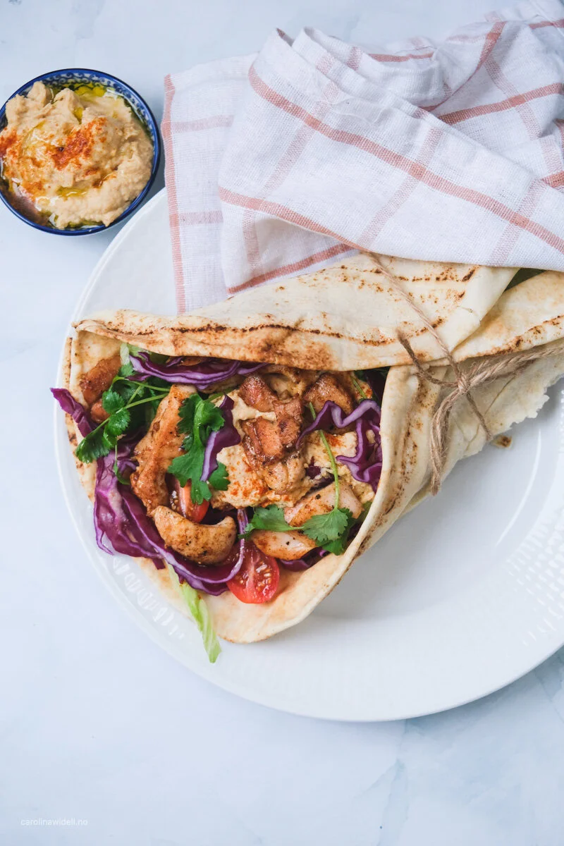 Den her kebaben er litt sunnere en kjøpevarianten, fullstappet med grønnsaker og istedenfor dressing en hjemmelaget hummus. Jeg har brukt kyllinglårfilet, fordi jeg syns det kjøttet er mye saftigere enn kyllingfilet, men man så klart bruke det kjøtt man ønsker, eller lage en vegetarvariant med f.eks. falafel.