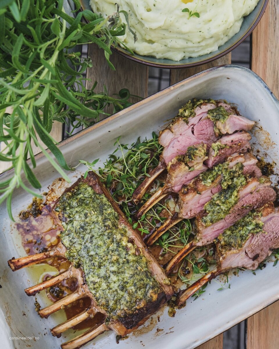 Lammecarré med forskjellige friske urter og parmesanost. Det ble litt urte og parmesanblanding til overs etter jeg hadde dekket lammecarréen med den. Det hadde jeg opp i potetmosen vi hadde til, så fikk også potetmosen deilig smak av urter og parmesan.