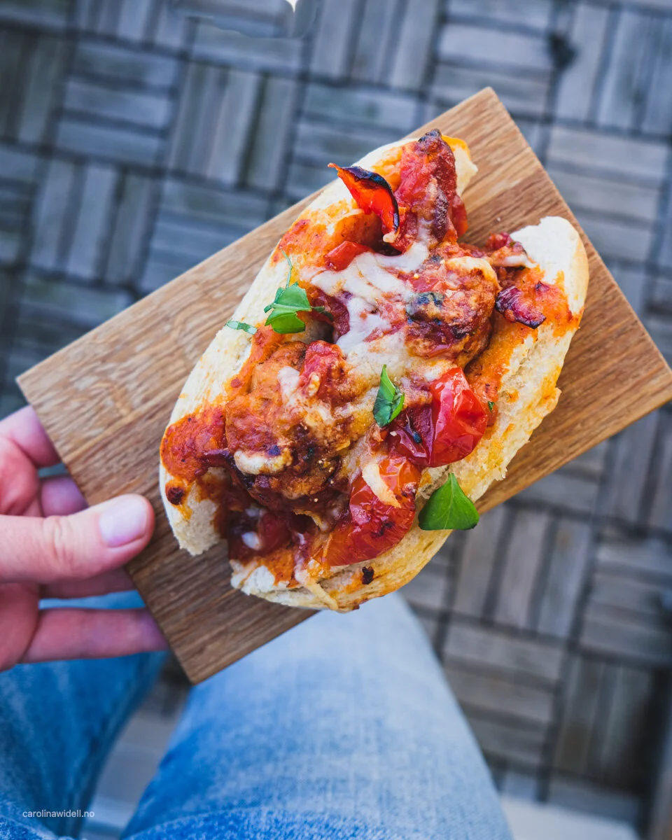 4. Kutt en skåre i baguettene. Den skal være på tuppen, ikke sidelangs slik man pleier å dele en baguette. Fyll baguettene med kjøttbollene og topp med tomatsausen og litt revet parmesanost