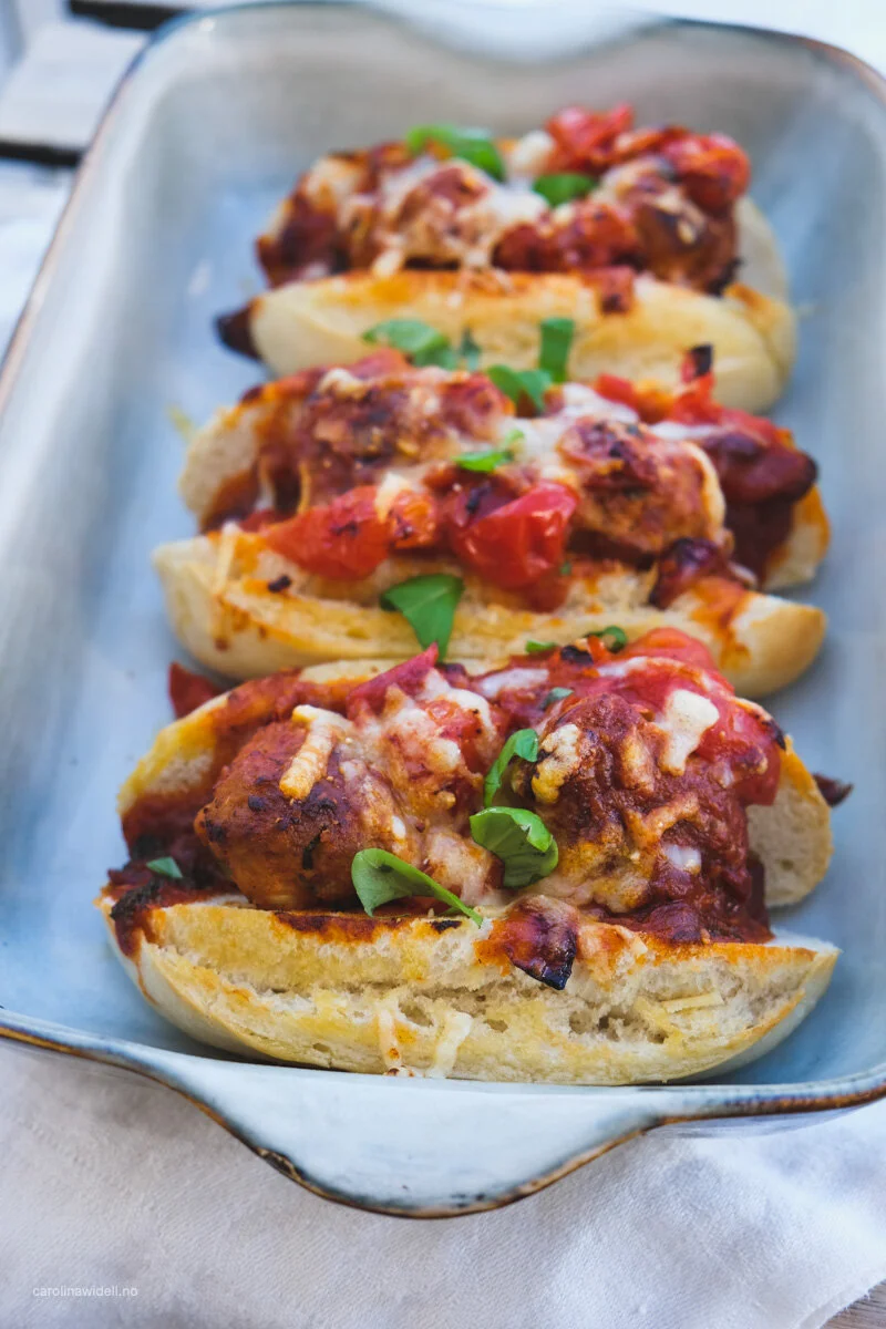 Kjedelige bake-off baguetter blir til skikkelig kosemat i ovnen sammen med disse gode kjøttbollene. Oppskriften tar ikke mer en 30 minutter å lage, inkludert tiden i ovnen.