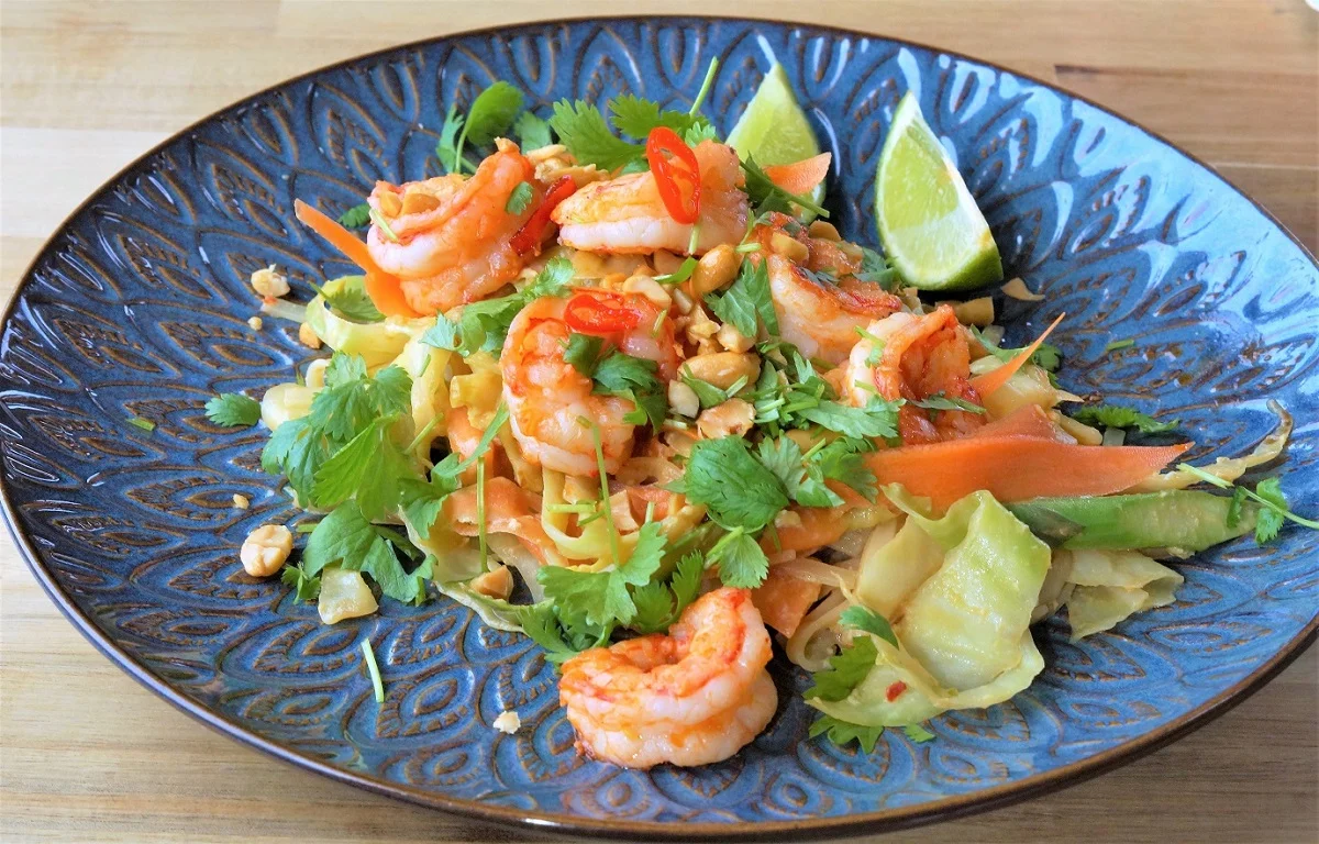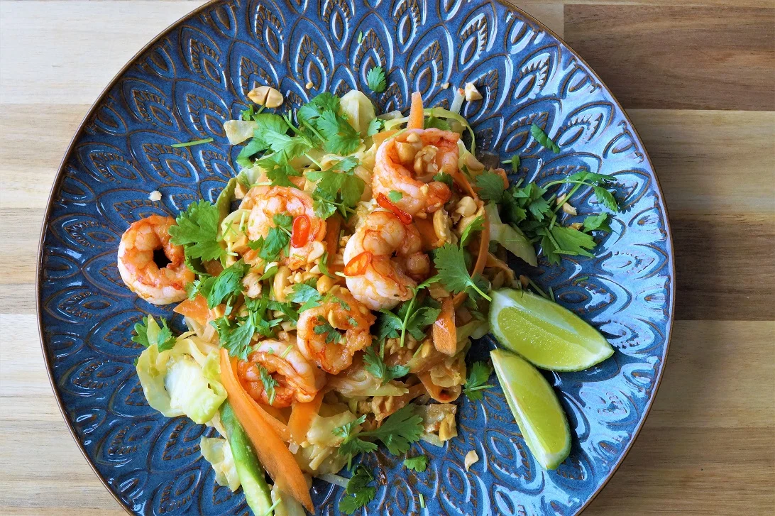 Pad thai er en rask nudelrett, hvor man kan bruke litt av hvert man finner hjemme av både grønsaker og kjøtt. Jeg brukte argentinske villreker, men man kan også bruke kylling, eller lage den helt vegetar. En god saus er det viktigste elementet for den rette smaken. Jeg lager min saus selv, men man kan også kjøpe ferdige sauser i butikk for å spare enda mer tid. Til 4 porsjoner brukte jeg kun halvparten av pakken med risnudler. Jeg har heller i mye mer hvitkål som både er sunnere og i sesong akkurat nå.