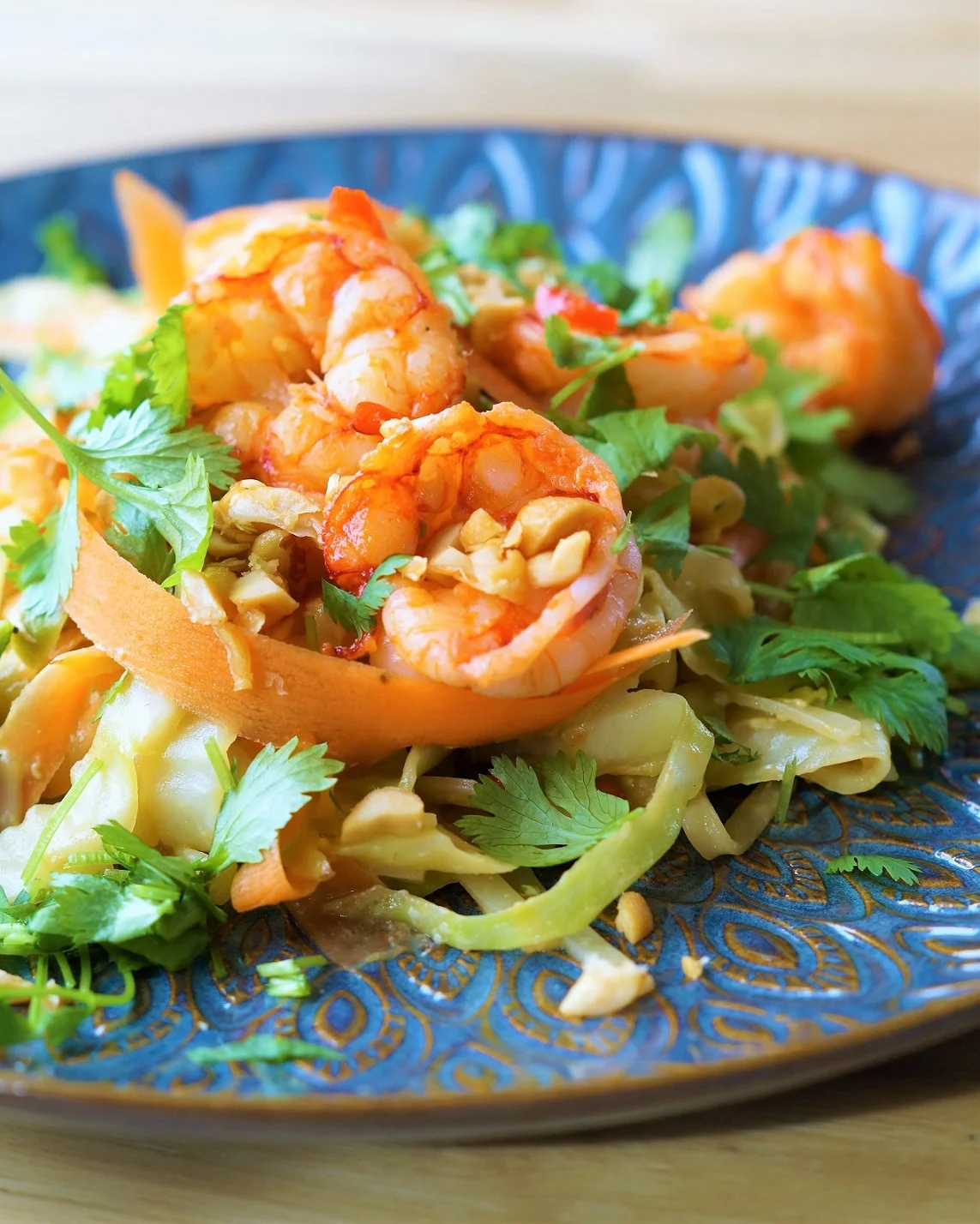 7. Legg opp på en tallerken og topp med hakkede peanøtter, masse koriander, lime og chilirekene.