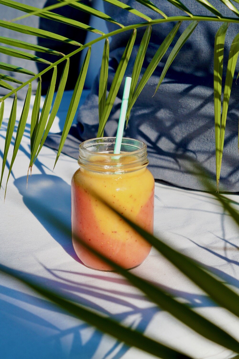 1.Kutt opp mango i biter og kjør den i en blender sammen med is, juice, banan og vaniljesukker.