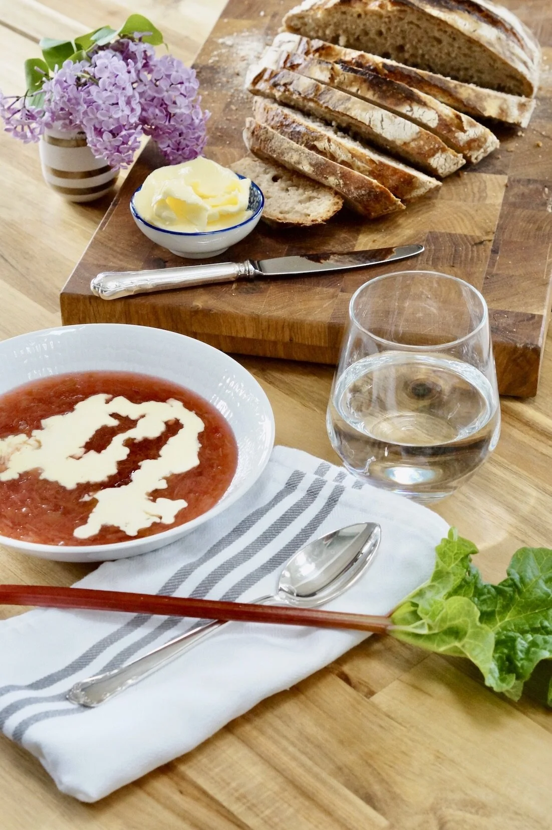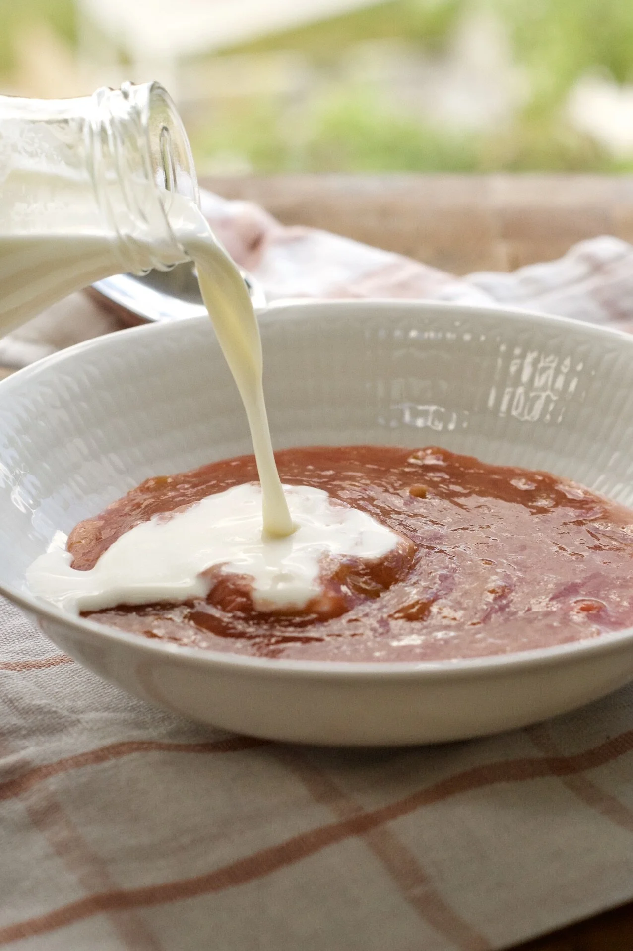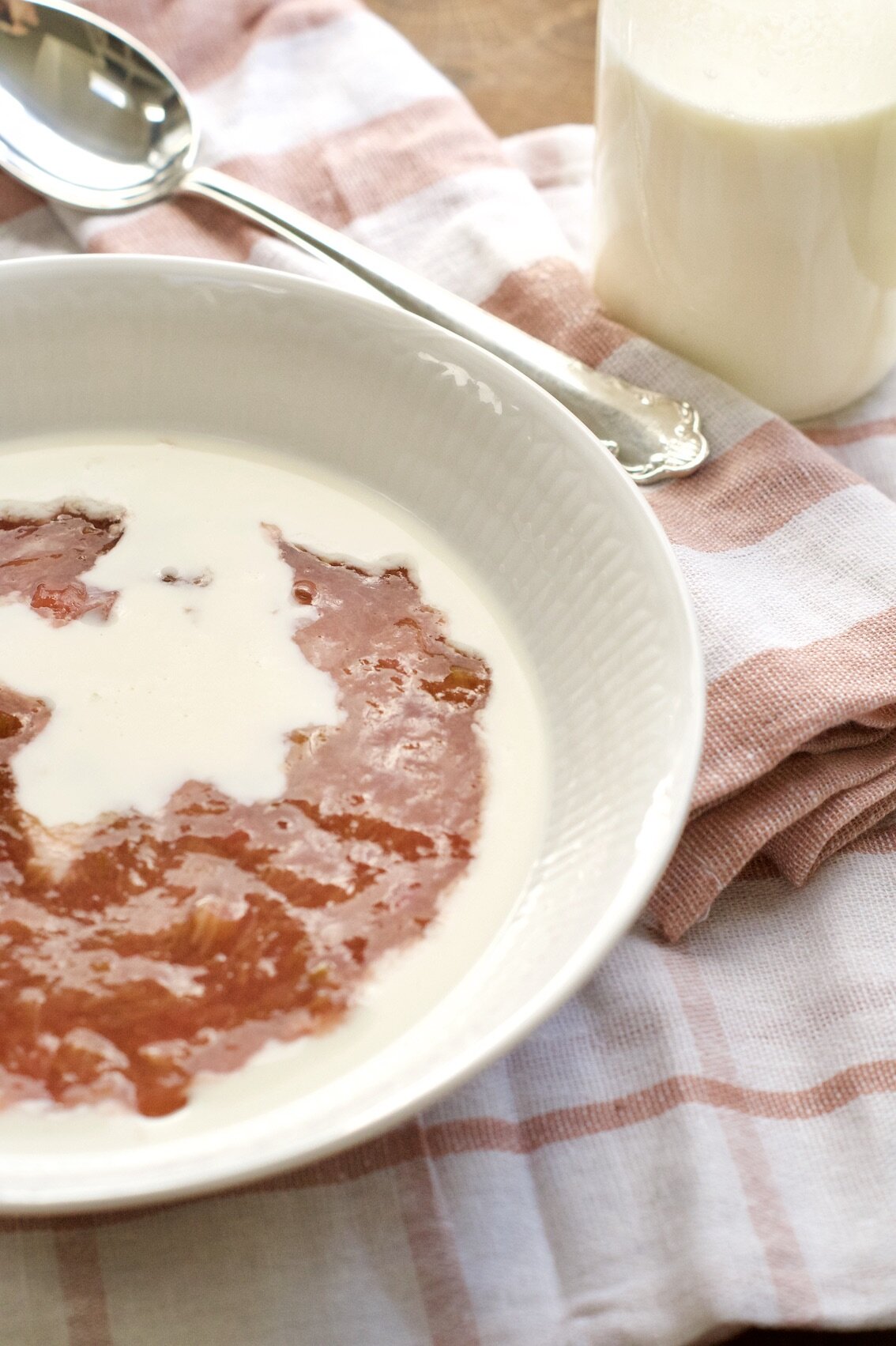 Rabarbrakompott, eller rabarberkräm som det heter på svensk fikk vi ofte som barn. Det er den enkleste måten å “kvitt” rabarbra som vokser seg alt for store i hagen. Den varianten rabarbra som jeg har i hagen er helt røde, og jeg plukker de når de er ganske tynne. Jeg trenger derfor ikke å skrelle de og da får kompotten en herlig rød farge. Rabarbrakompott må alltid serveres varm, med en blanding mellom kremfløte og kald melk, syns jeg. Sammen med noen skiver surdeigsbrød er dette en perfekt lunsjrett.