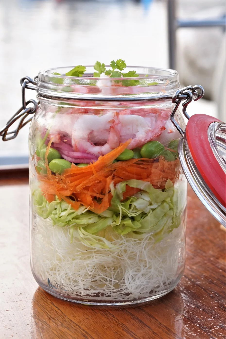 Ramen på glass er perfekt turmat hvis man har mulighet til å varme opp buljong. Man kan også ha buljong på termos hvis man ikke har kokemuligheter. Det går å variere i det uendelige. Man kan ha i alle mulige slags grønnsaker og forskjellige typer kjøtt eller helt vegetar. Vi valgte reker denne gang, fordi vi var på båten og det føltes passende. Jeg hadde veldig tynne nudler i min ramen. Da kan man ha de tørre, og de vil bli myke av den varme buljongen. Hvis man ønsker litt tykkere nudler må man koke de først å kjøle de ned. Jeg syns det er veldig praktisk med å oppbevare ingrediensene til ramen i to Norgesglass (annonselinke) fordi de holder helt tett og er vakre å se på.
