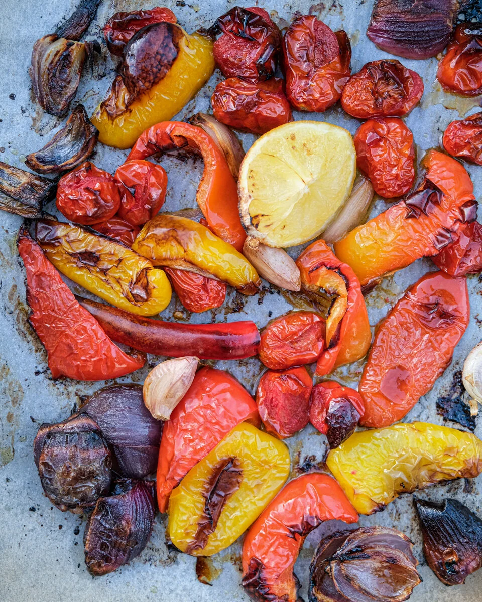 Kutt grønnsakene i ganske store biter, hvis de blir for små blir de bare brente ikke ristede. Hvitløken lot jeg være hel med skallet på.