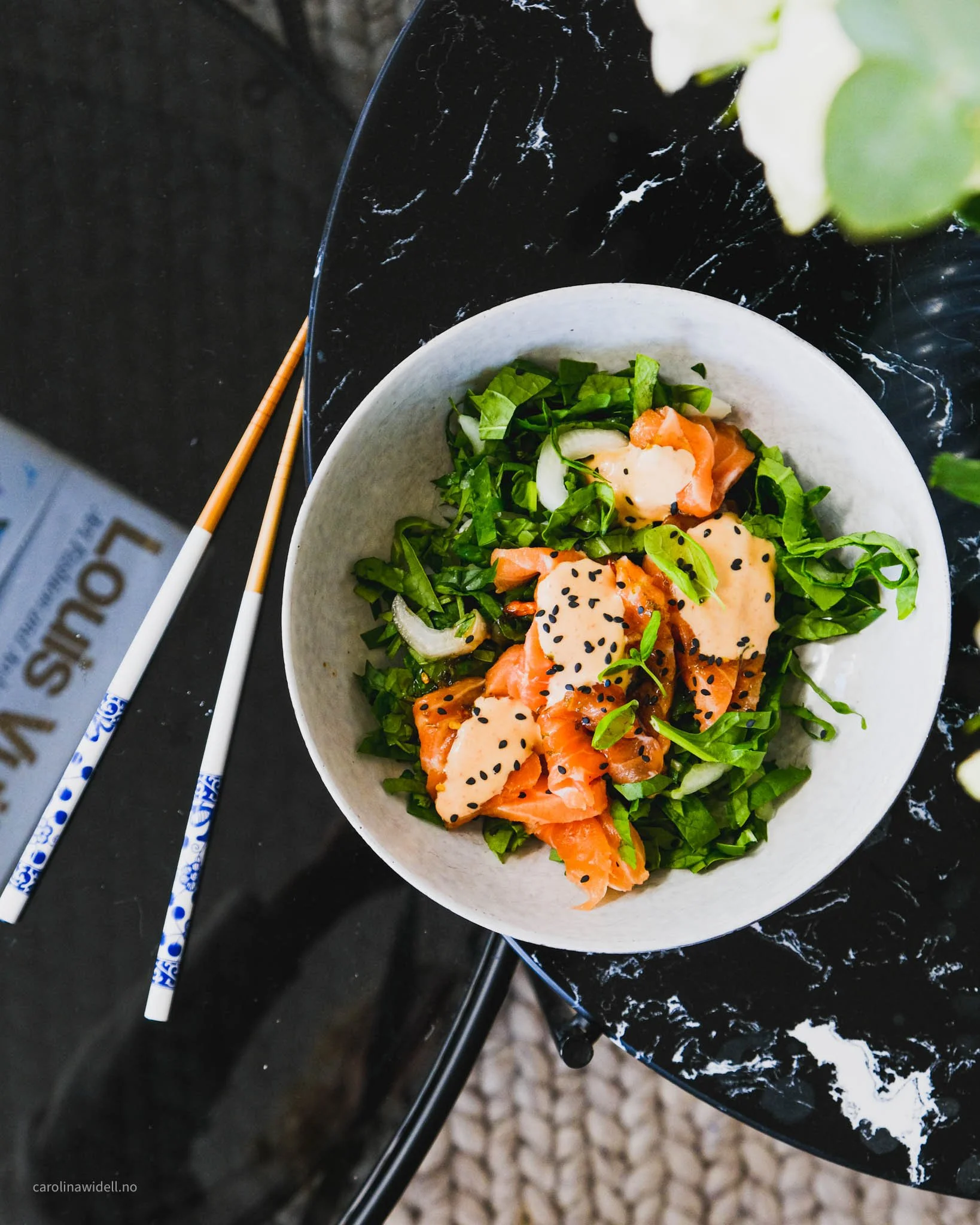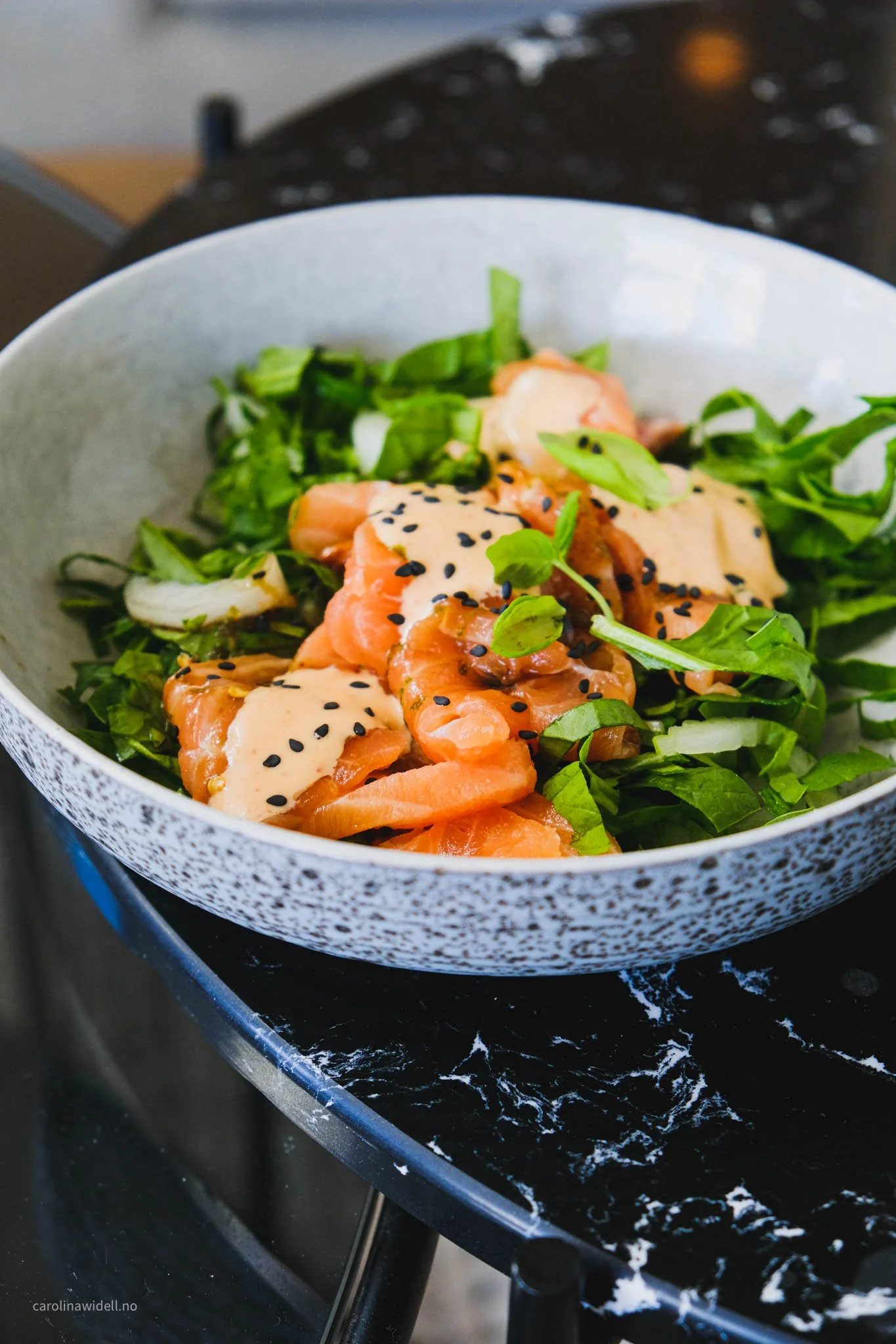 Anrett salaten på tallerekener, topp med sashimi, dressing og til sist srirachamajones. Dryss over litt sesamfrø.