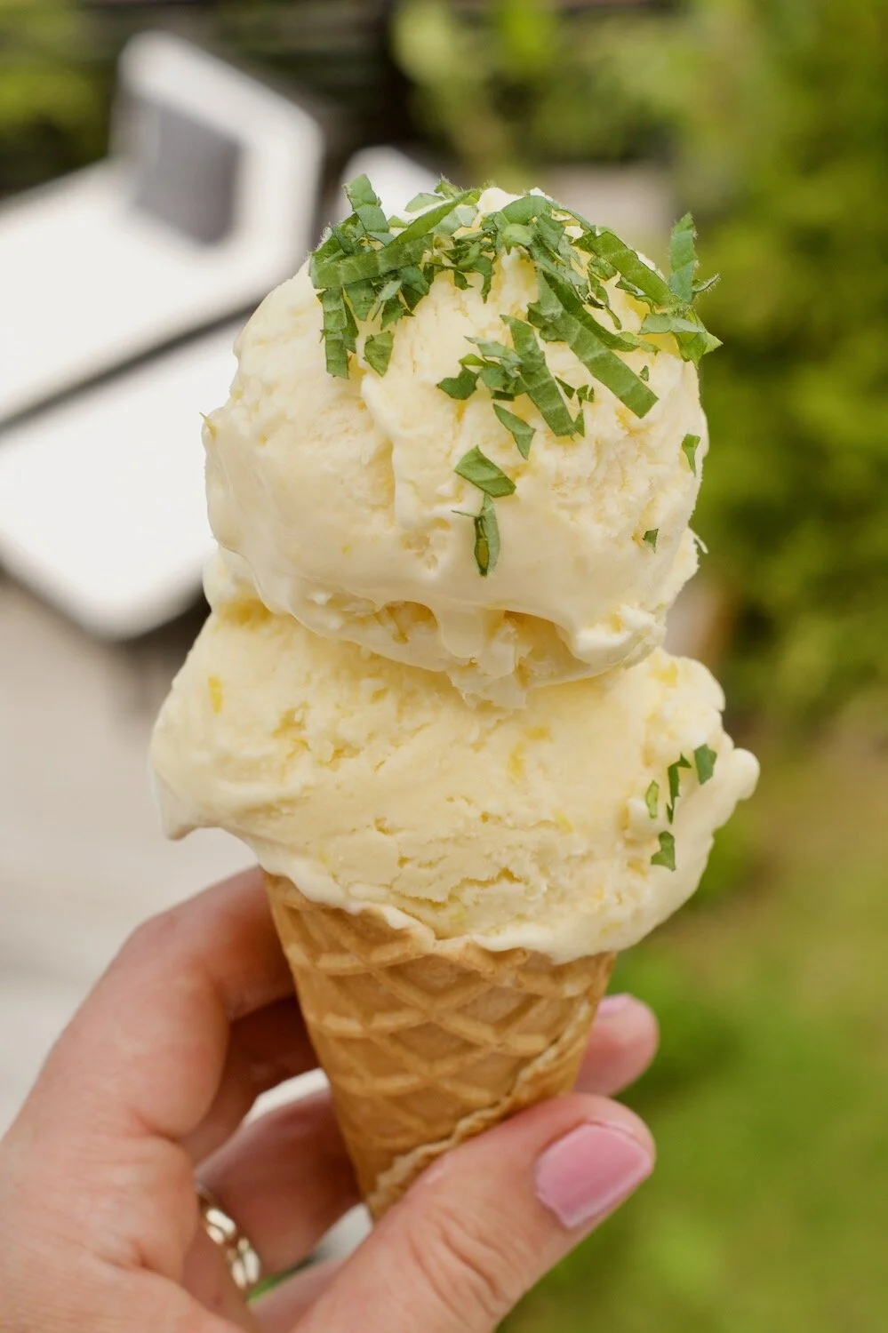 Denne hjemmelagede sitronisen er både søt og syrlig. Til de voksne pyntet jeg isen med friske urter og det passet overraskende bra sammen med sitronsmaken.