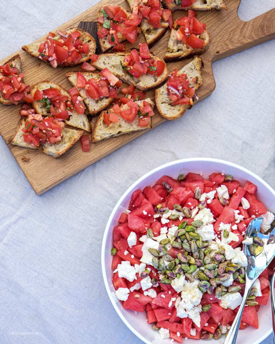Den her salaten er perfekt på varme sommerfester. Det er så godt med det søte fra vannmelonen blandet med den salte osten. Og så litt cruch fra pistasjnøttene. Salaten går å lage i forvei, men legg på pistasjnøttene akkurat før servering, hvis ikke blir de myke.