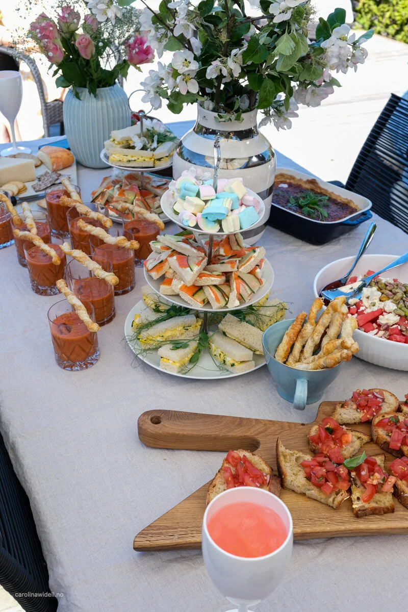 I helgen hadde jeg en liten sommerfest i min hage for noen venninner. Det var veldig varmt og jeg prøvde å lage retter som var enkle å forberede dagen i forvei, samt passet i sommarevarmen. Alle retter utenom en, var dessuten vegetarretter, slik at det skulle passe for alle.