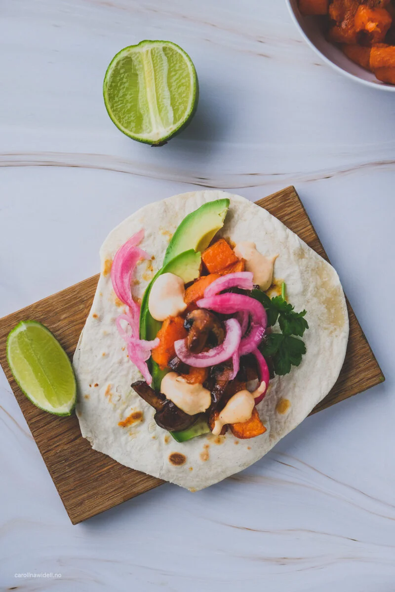 Jeg prøvde meg å lage hjemmelagde tortillabrød den her gangen, men det vil jeg ikke anbefale fordi så gode ble de ikke. Det tok også ganske lang tid. Tid hadde jeg for så vidt når søtpotetene var i ovnen, men uansett kunne jeg sikkert gjort noe annet.