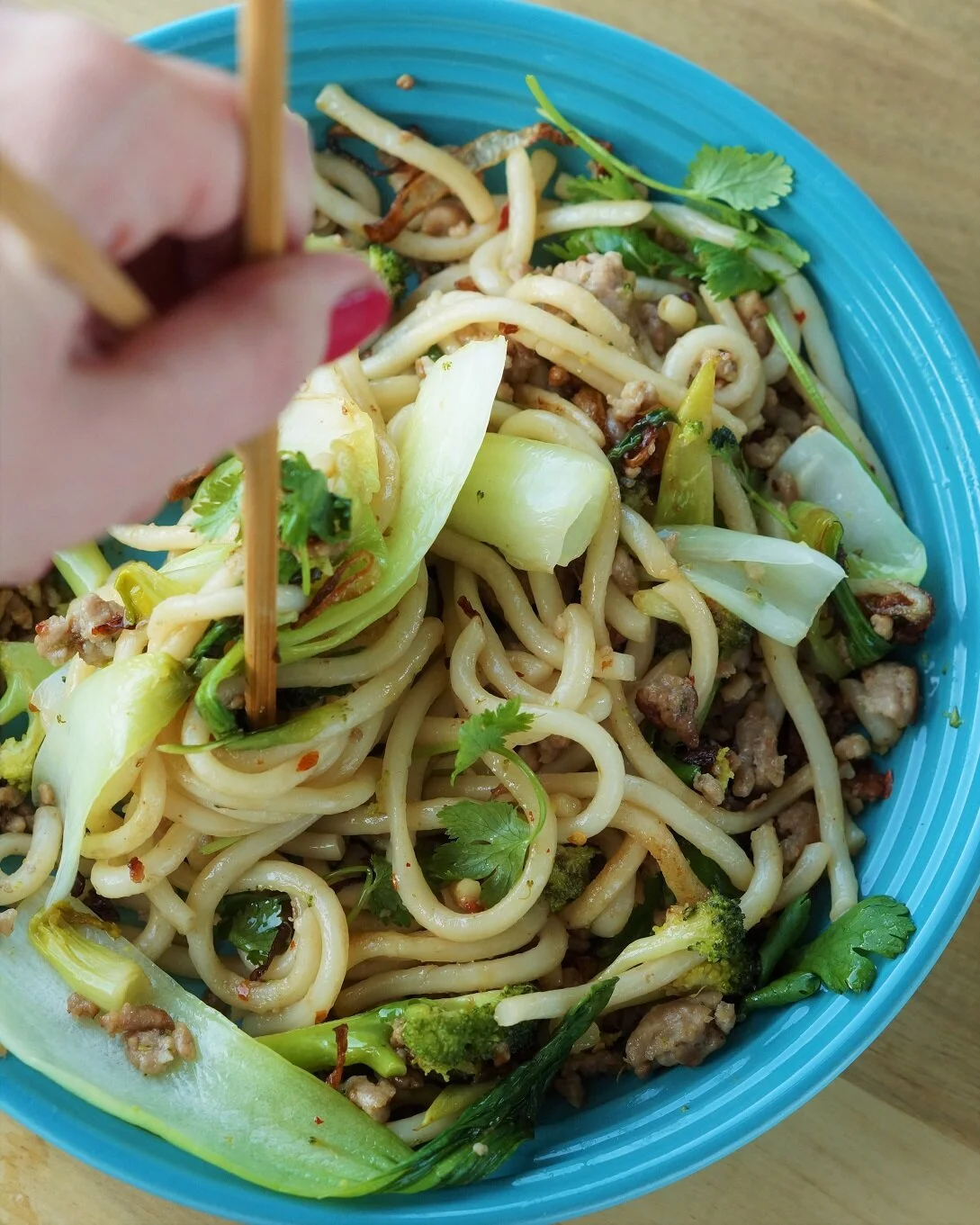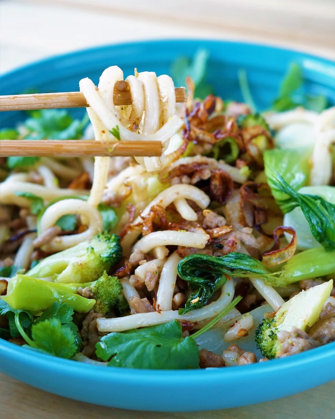 Oppskrift stir-fry udonnudler med svinekjøttdeig og pak choi
