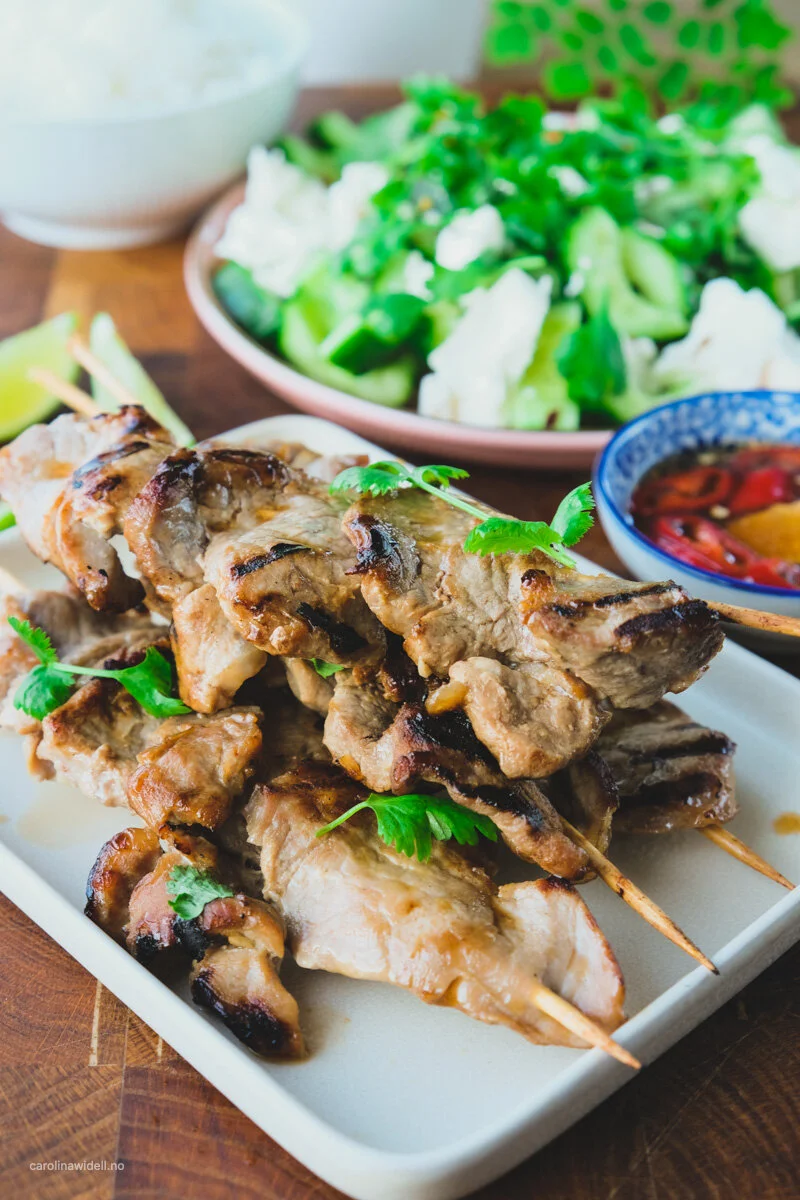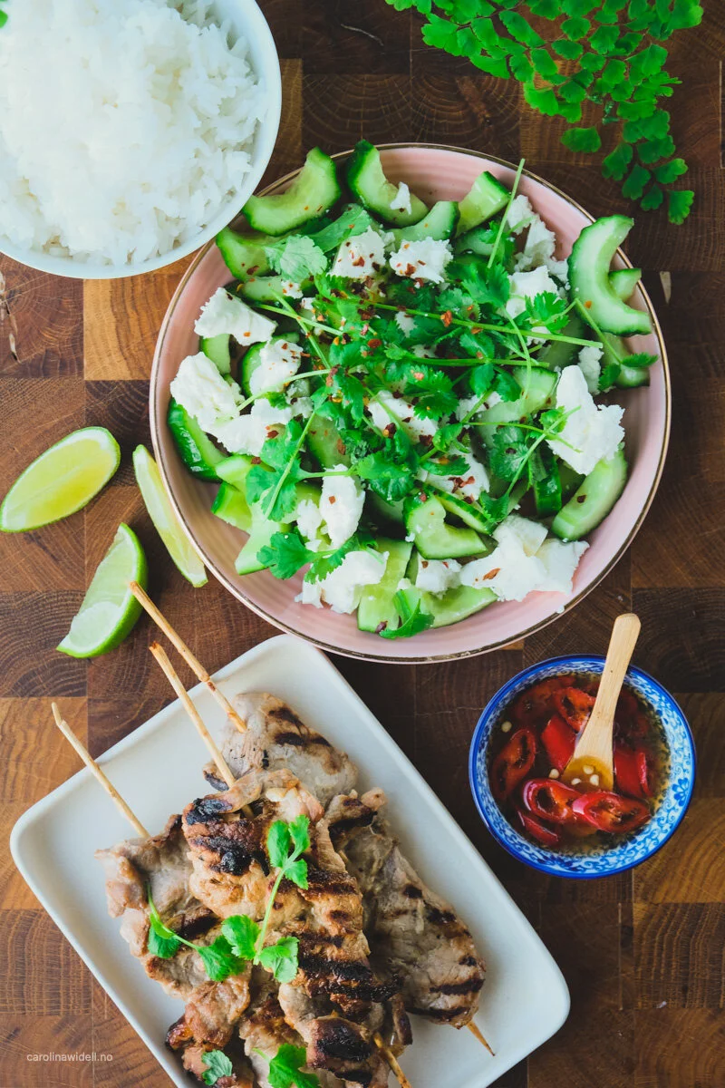 Dette er en ganske barnevennlig rett, men som allikevel har mye smak. Ris og ”kjøtt på pinne” går hvert fall hjem i vår familie. Til de voksne kompletterte jeg retten med en agurk og fetaostsalat, også den litt thai-inspirert. Barna hadde rømme på risen men vi hadde en slags dressing med fiskesaus, chili og limesaft til.
