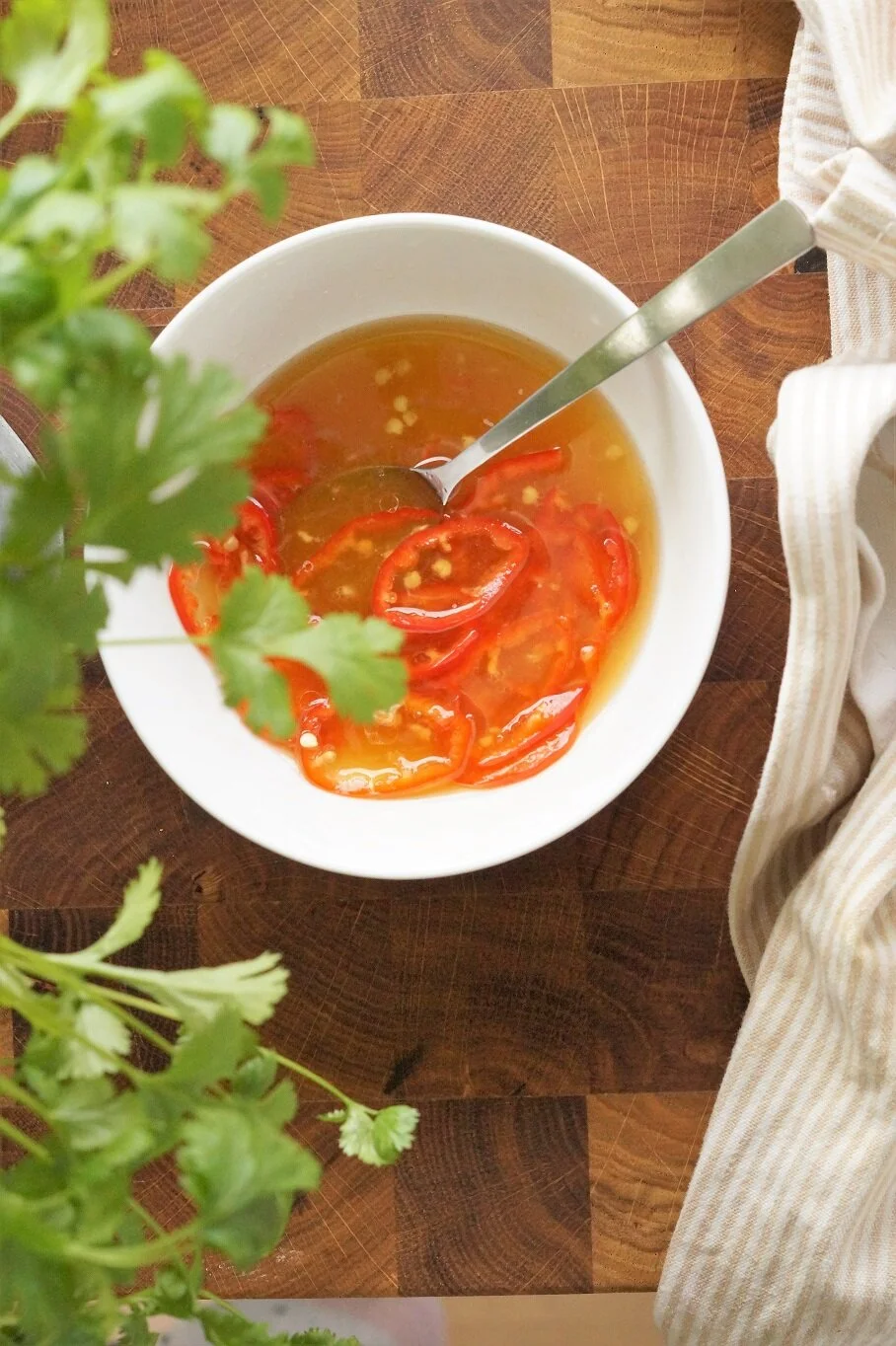 3. Bland alle ingredienser til dressingen. Rør slik at sukkeret blir løst opp.