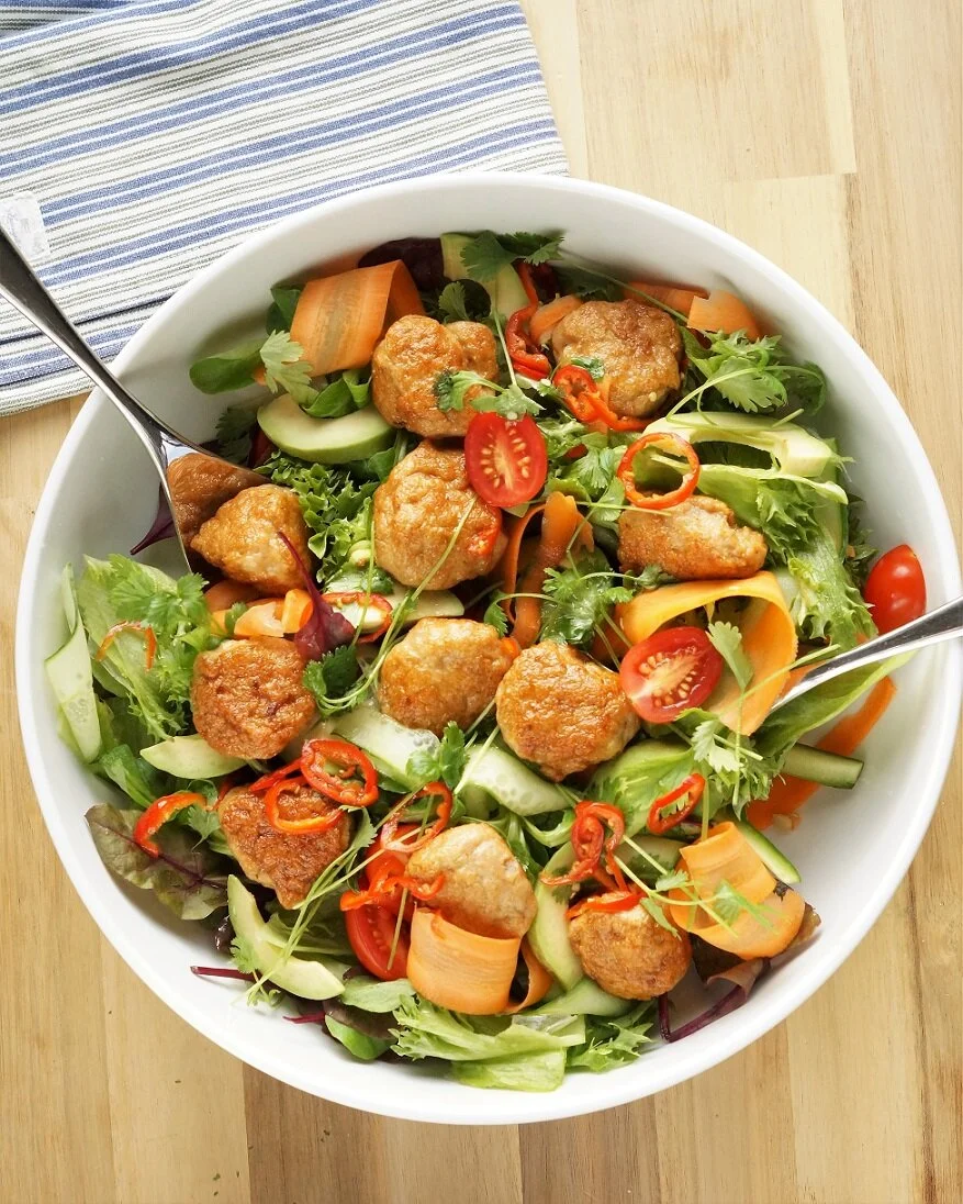 Salater med thaismaker kan aldri få for mange av, og dette er en variantene som vi pleier å lage. Disse spicy kjøttbollene kan man lage enten med kjøttdeig av svin eller kjøttdeig av kylling. Jeg foretrekker nok kjøttdeig av svin.