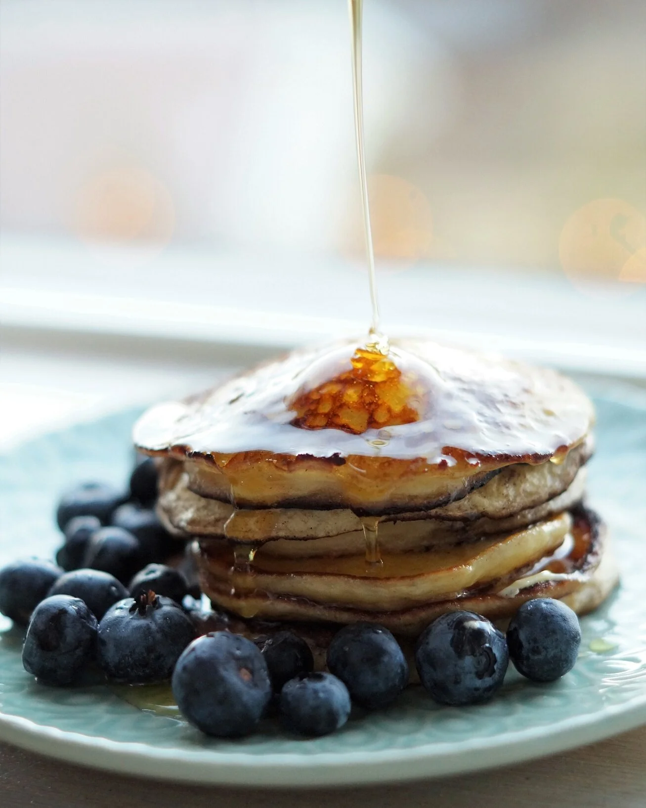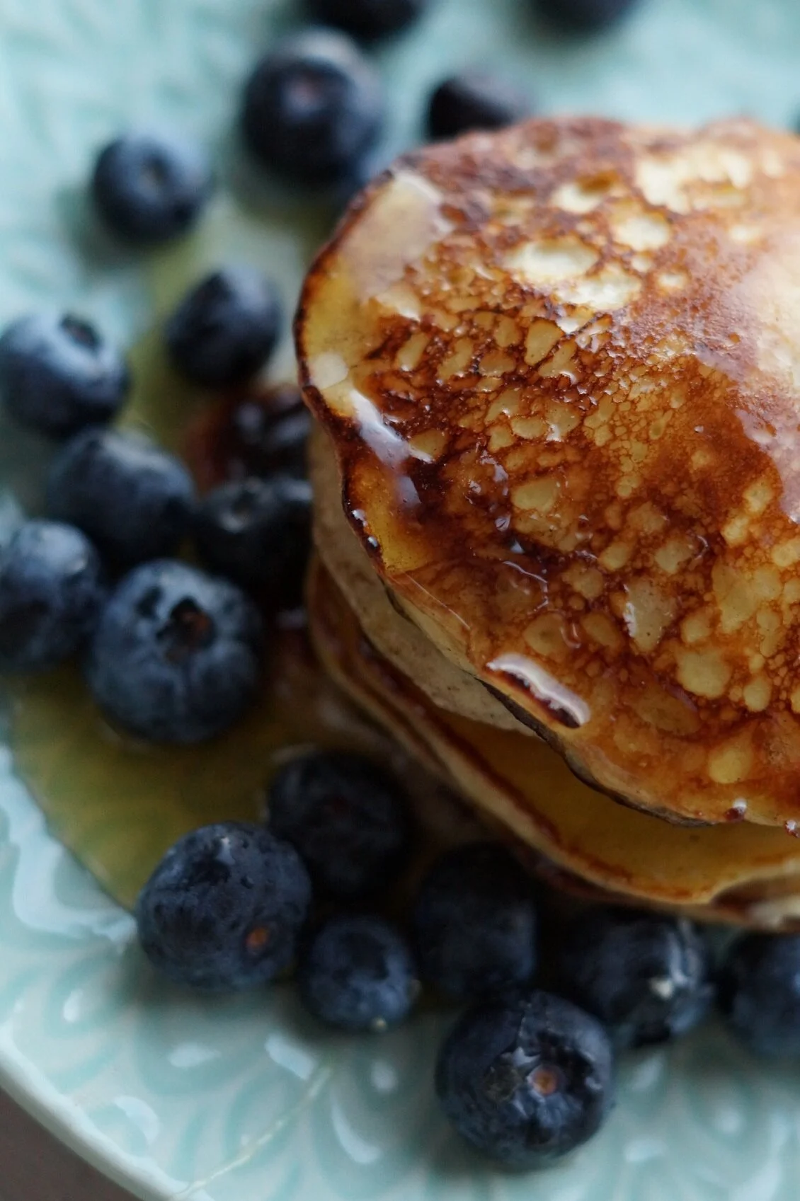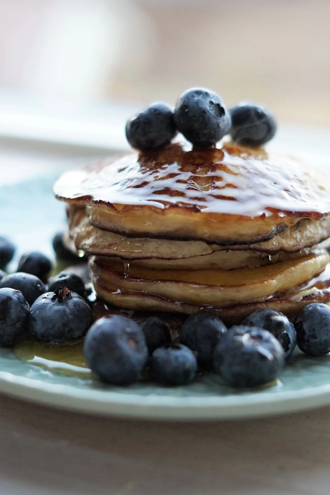 Jeg sa ikke at dette var bananpannekaker, og det virket ikke som barna merket noe heller, fordi de kommenterte ikke at de smakte litt av banan. Men de spiste godt begge to og havnet i slåsskamp over blåbærene, som er veldig populære her hjemme også.